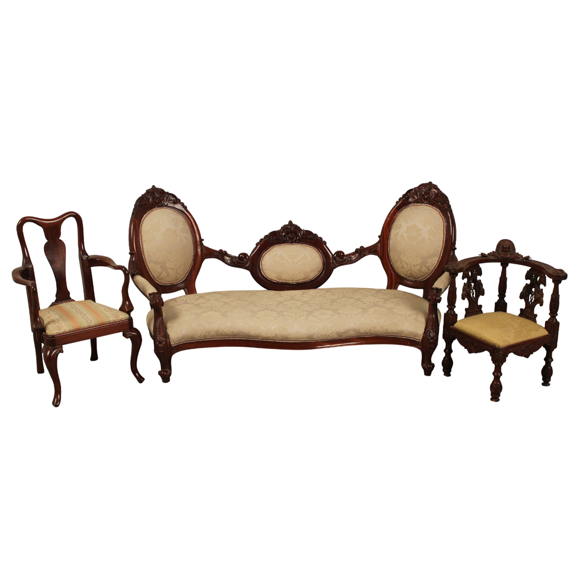 Divanetto e due poltrone in miniatura Legno scolpito e intagliato. Sicilia. Fine secolo XIX. Cm 110x50 h 57 (divanetto)