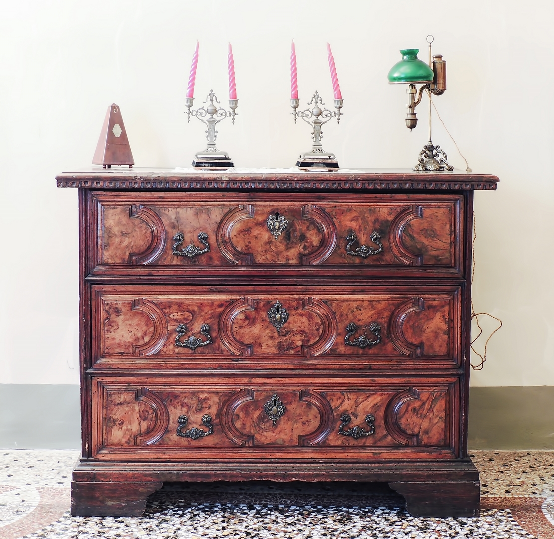 CASSETTONE LISTRATO IN NOCE E RADICA DI NOCE XVII secolo fronte dritto a tre cassetti con formelle sagonate, base modanata, piedi a mensola, alcuni restauri h cm 107x131x60