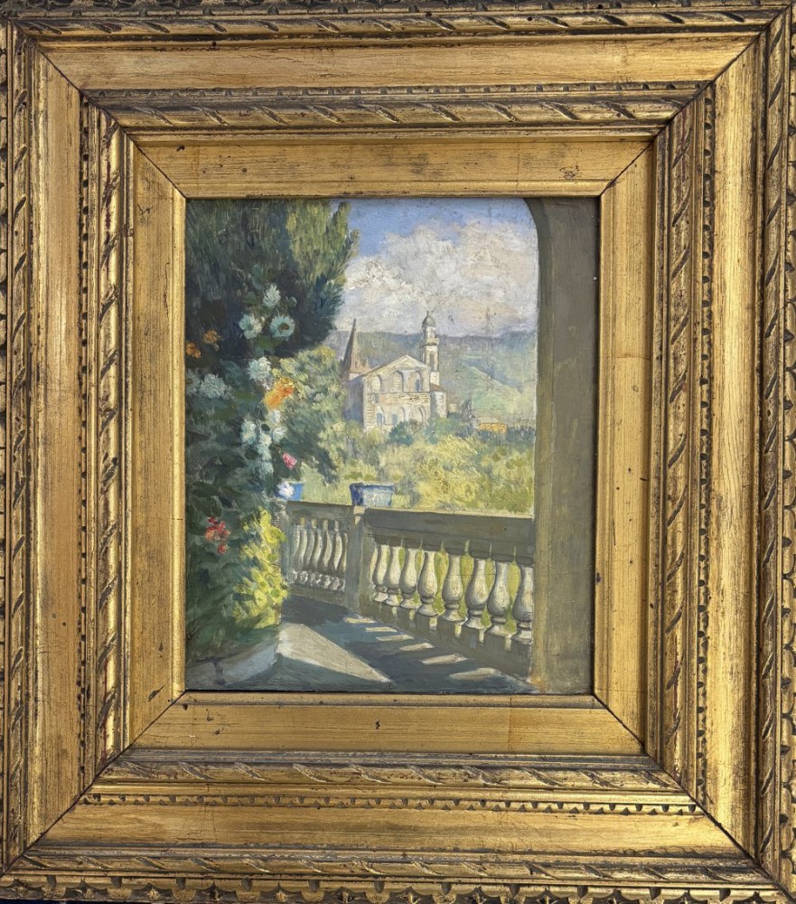 Donadio Attivo in Liguria XX Secolo Basilica di San Salvatore a Cogorno sopra Chiavari, Olio su tavola cm 19,5x23,5 firmato al retro datato 1940