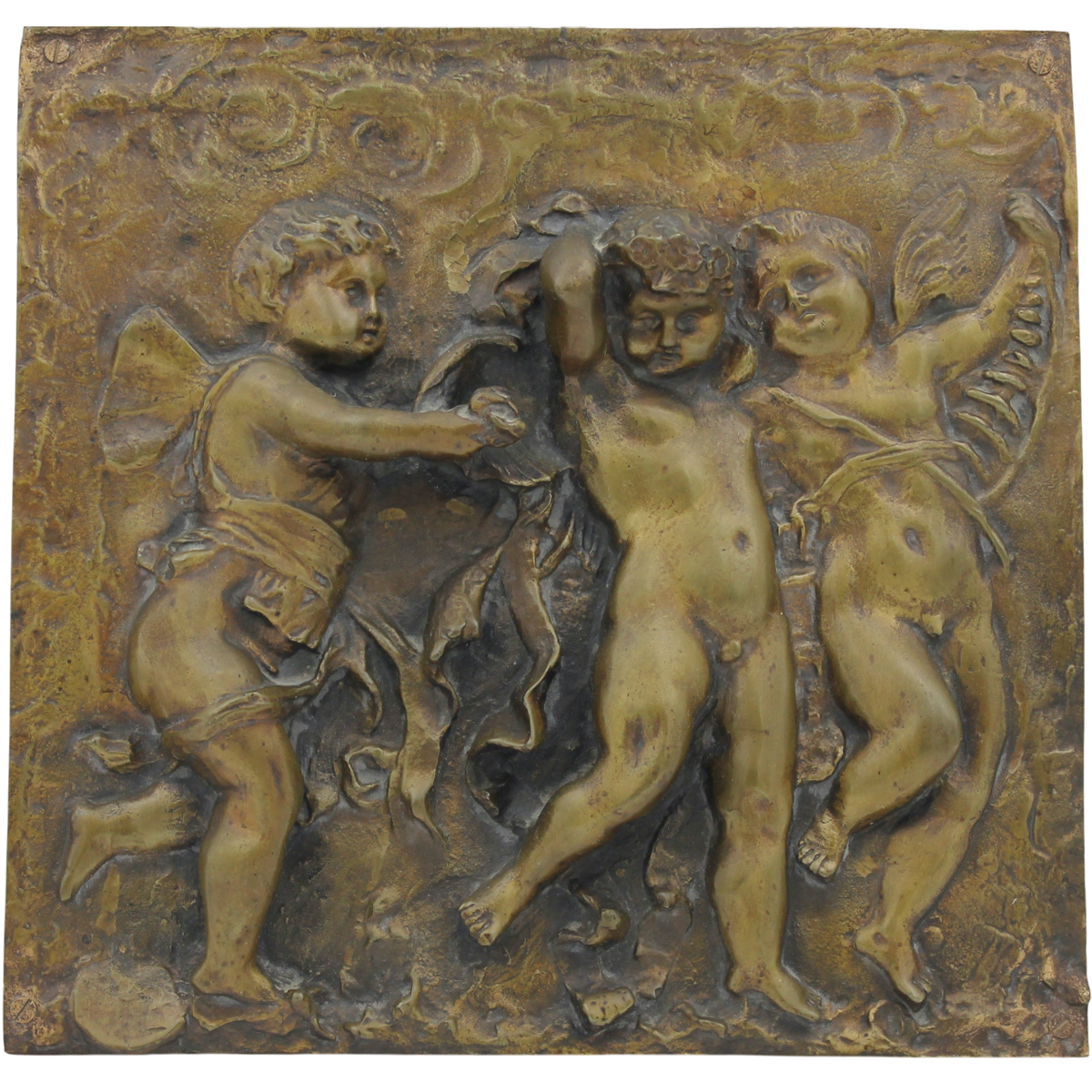 Putti danzanti Bassorilievo in rame dorato. Secolo XIX. Cm 32x32,5