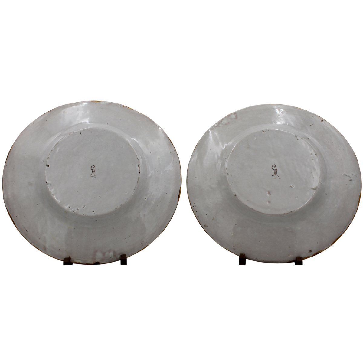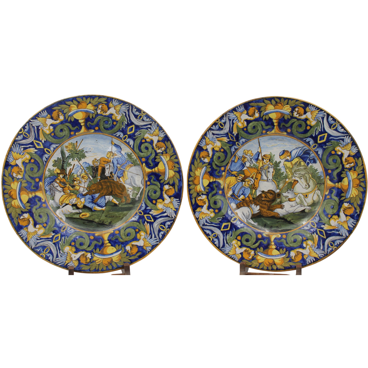 Coppia piatti Maiolica policroma decorati con scene di caccia all'orso. Carlo Mollica. Napoli. Seconda metà del secolo XIX. Cm d 35
