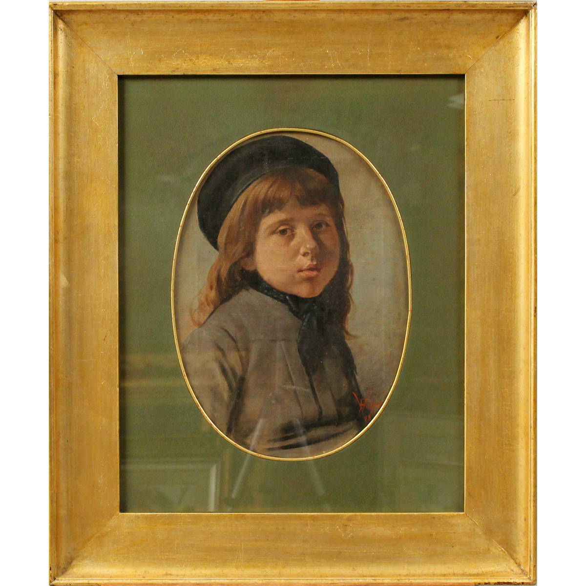 Pietro Volpes (1830/1924) "Figura di bambino con cappello" Dipinto ad olio su tela applicata su faesite in cornice. Datato '88. Cm 30x40