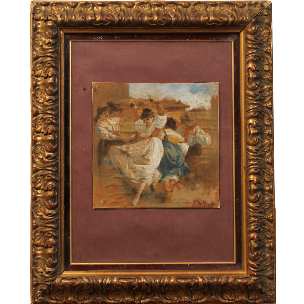 Ettore De Maria Bergler (1850/1915) (att.) "Danza popolare" Bozzetto ad olio su tela applicata su cartone in cornice in legno dorato. Cm 21x21
