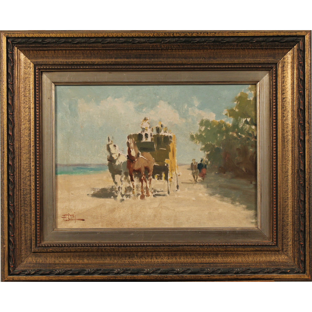 Aurelio Catti (1895/1966) "Carrozza in riva al mare" Dipinto ad olio su tavola in cornice in legno dorato. Cm 27x38