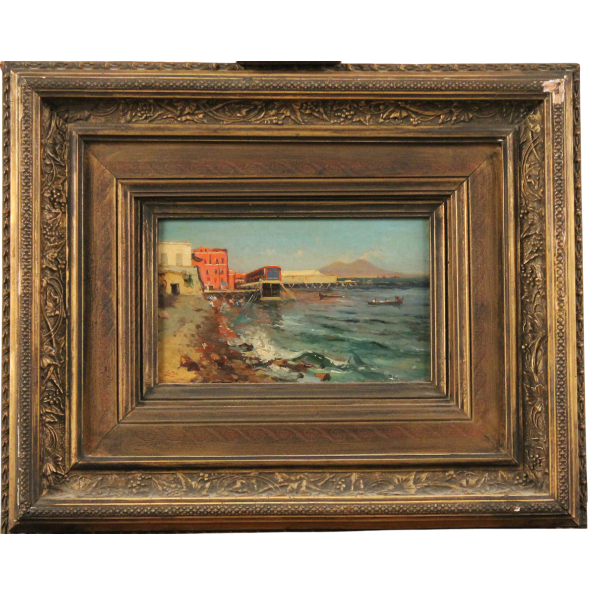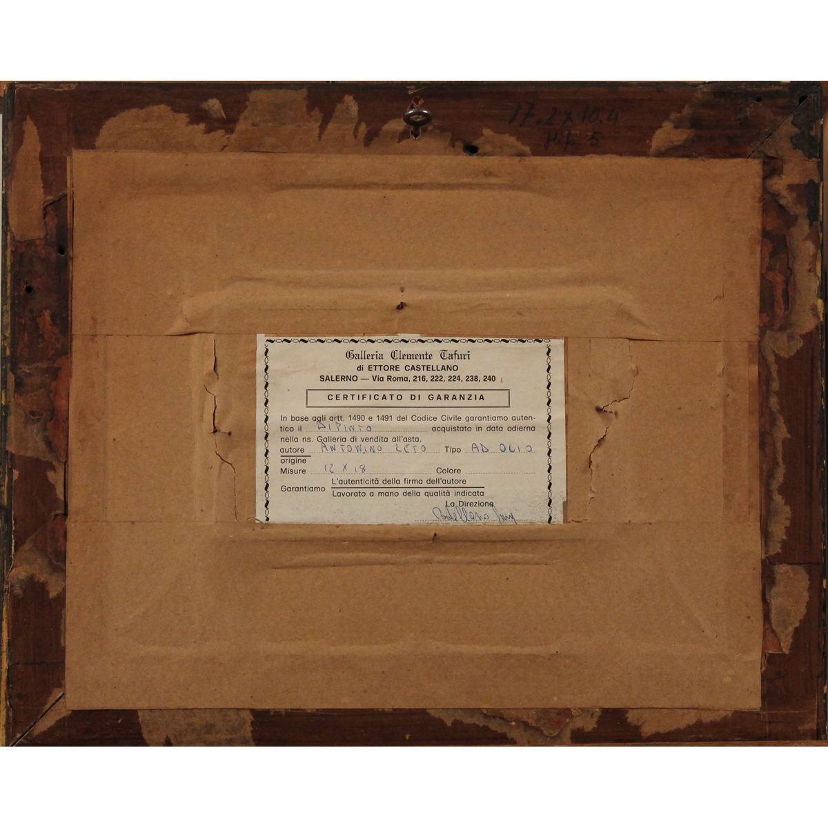 Antonino Leto (1844/1913) "Veduta del Vesuvio" Piccolo dipinto ad olio in cornice dorata. Sul retro certificato della Galleria "Clemente Tafuri" Salerno. Cm 12x18