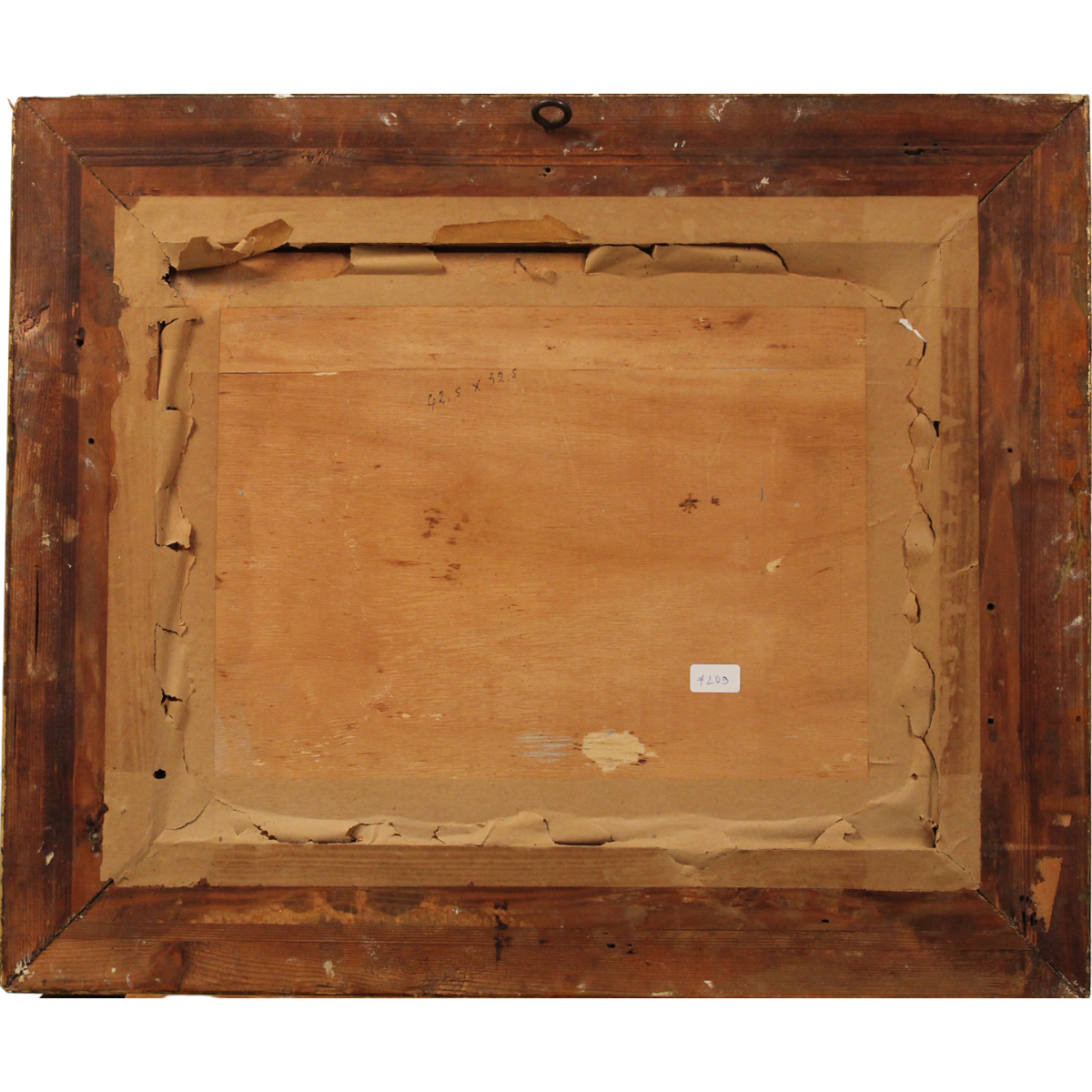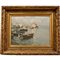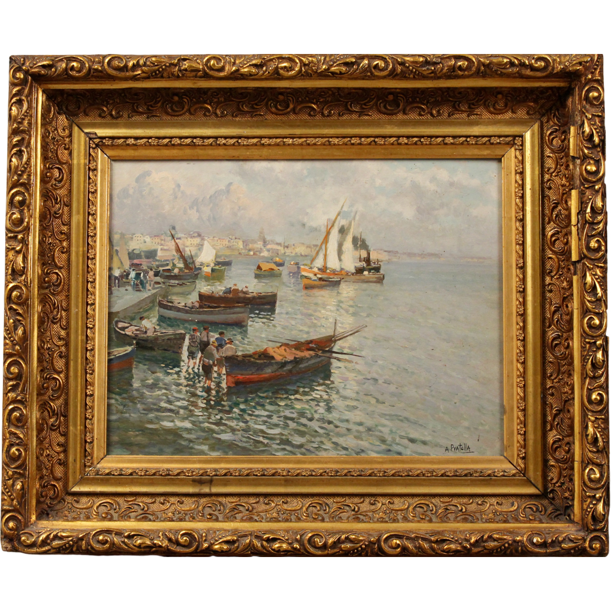 Attilio Pratella (1856/1949) "Marina con barche di pescatori" Dipinto ad olio su tavola in cornice in legno dorato. Cm 32,5x42,5