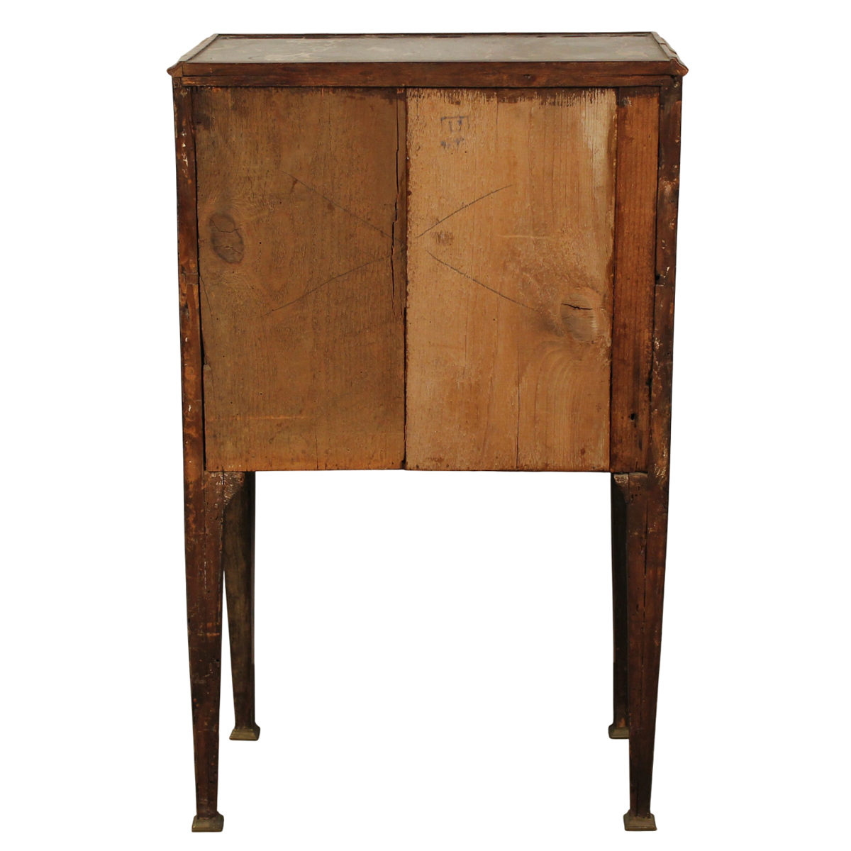 Comodino a due cassetti Palissandro con perfili in legno rosa e maniglie in bronzo dorato. Piano incassato in marmo portoro. Sicilia. Epoca Luigi XVI. Cm 52x29 h 85