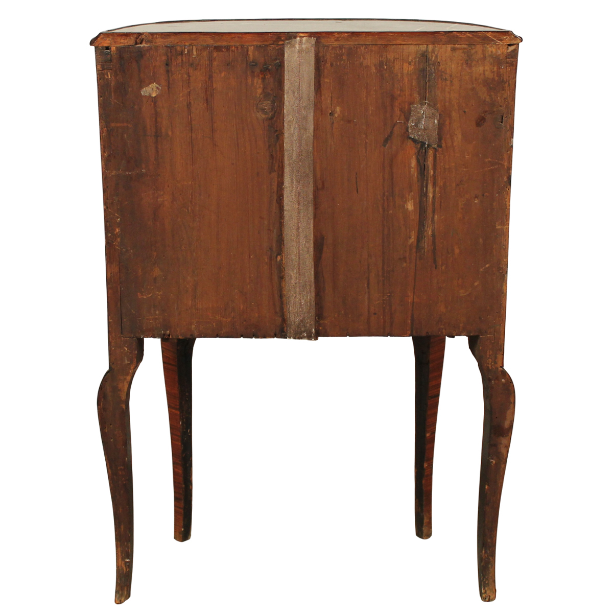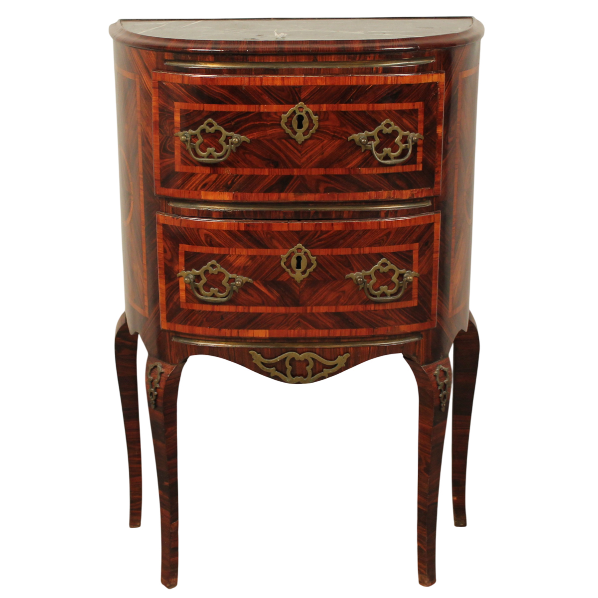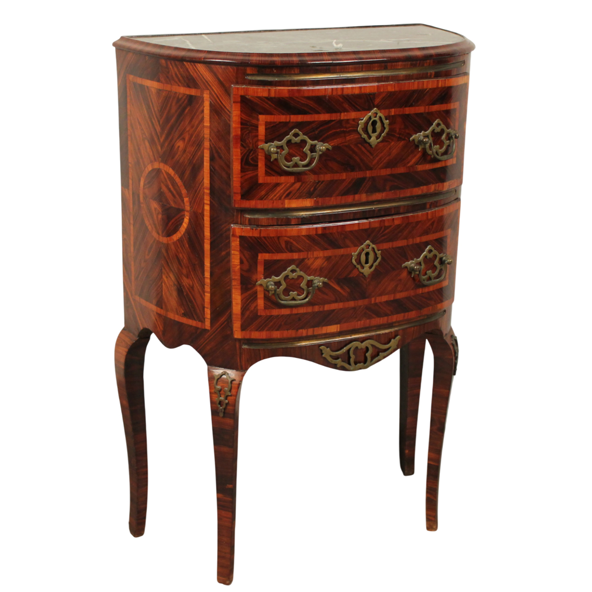 Comodino a due cassetti Ebano violetto con perfili in legno rosa a motivi geometrici, maniglie in bronzo dorato e piano in marmo verde incassato (piano in marmo di epoca posteriore e restauri). Sicilia. Fine secolo XVIII - inizi secolo XIX. Cm 59x30 h 84