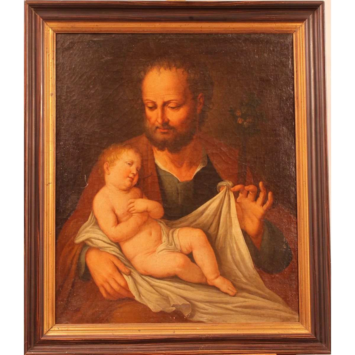 Scuola siciliana del secolo XVIII "San Giuseppe con Bambino" Dipinto ad olio su tela in cornice in legno (rifoderato e lievi restauri). Cm 62x73