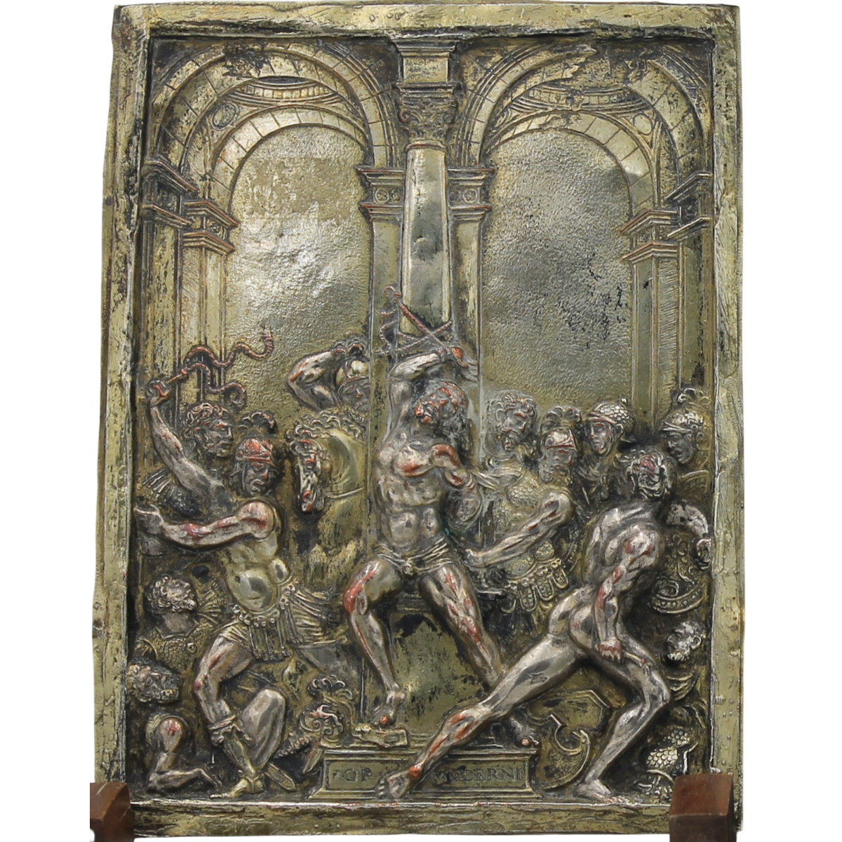 Scuola di Galeazzo Mondella "Flagellazione" Placca in rame argentato e...