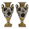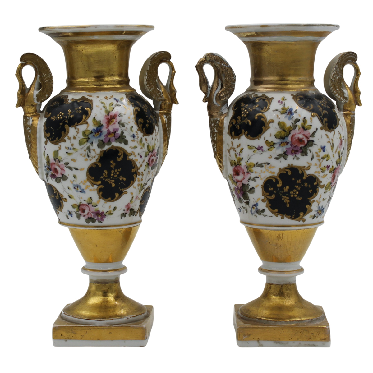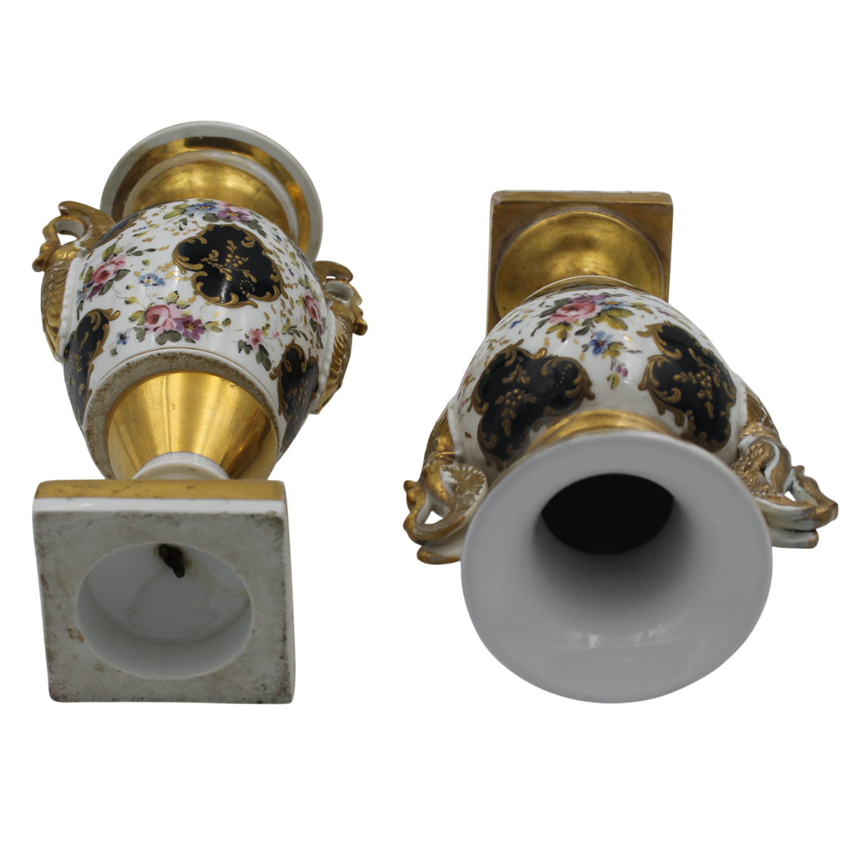 Coppia vasi Antica porcellana decorata a motivi floreali con cigli alati ai manici e decori dorati a rilievo (restauri). Francia. Secolo XIX. Cm h 28,5