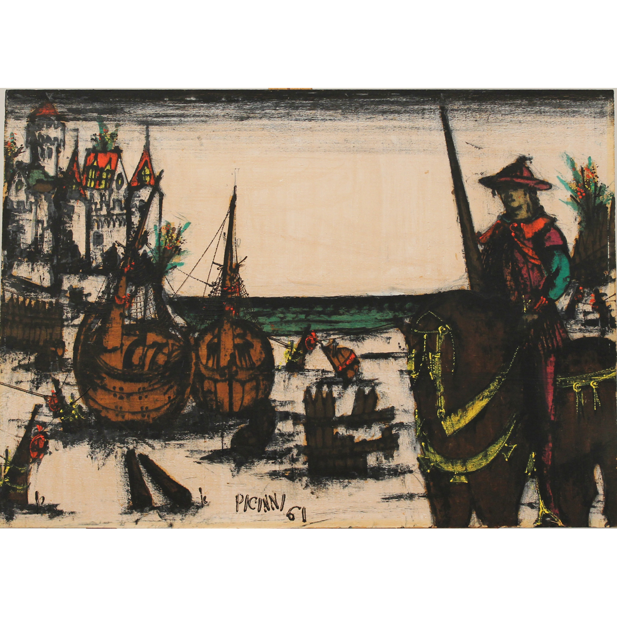 Marina con velieri e figure Dipinto ad olio su compaensato in cornice. Firmato Picinni ' 61. Sul retro timbro a secco della Galleria "Il cenacolo" Palermo. Cm 50x70