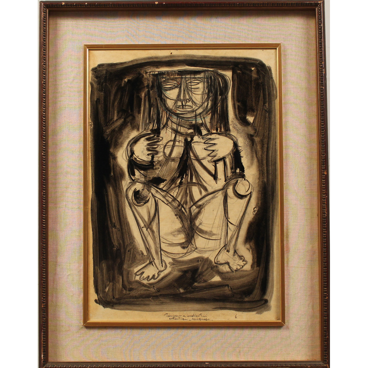 Figura Tecnica mista su tela in cornice. Firmato Migneco. Sul retro timbro a secco dello Studio d'Arte "Mercurio" Milano. Cm 57x40