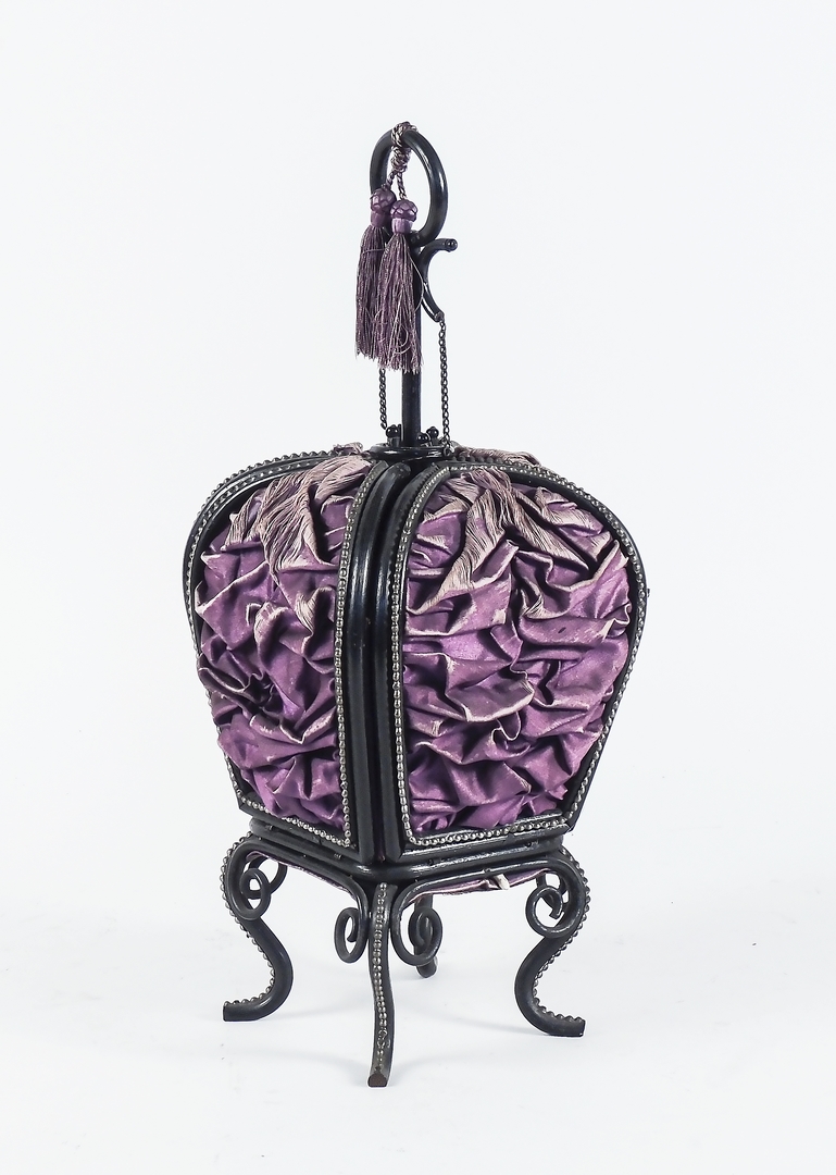 realizzato come una cupola in legno ebanizzato e seta goffrata viola che si apre a quattro spicchi, su quattro piedini mossi, all'interno vari utensili da cucito in avorio