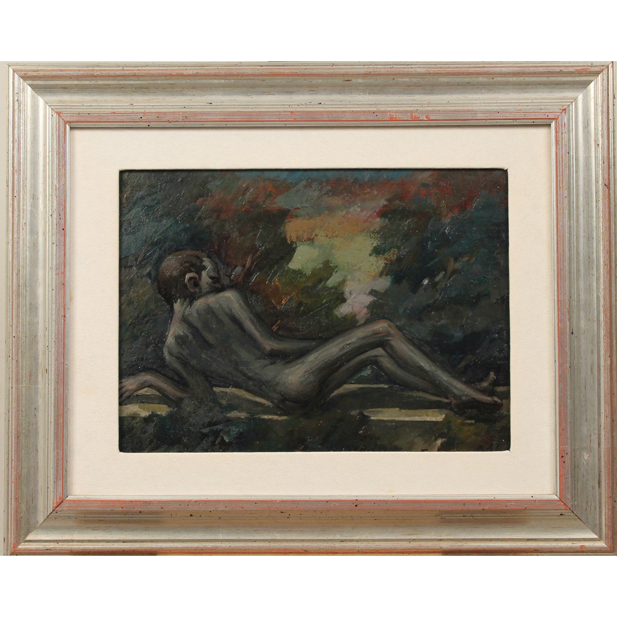 Nudo disteso Dipinto ad olio su tela in cornice argentata. Firma indistinta. Secolo XX. Cm 30x40
