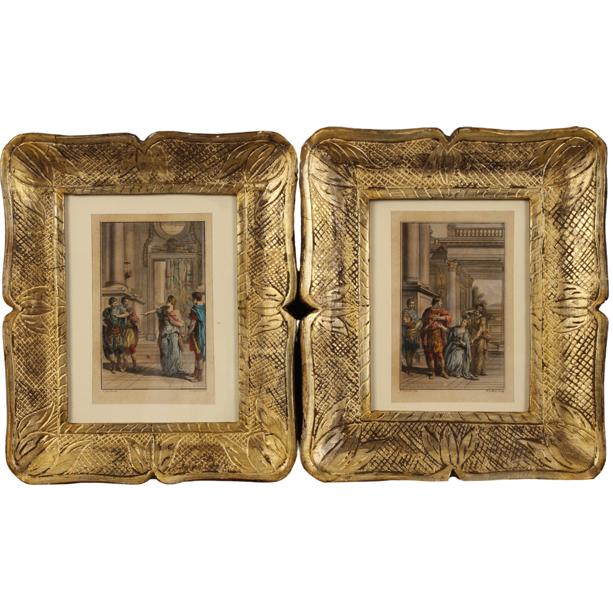 Coppia di stampe Stampe acquerellate inserite in cornici a vassoio in legno dorato e inciso. Secolo XX. Cm 21x18,5 (misura interna)