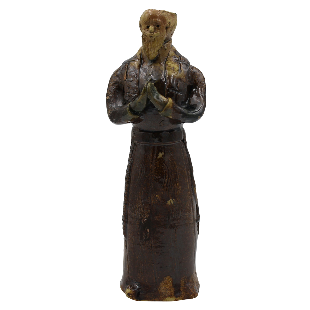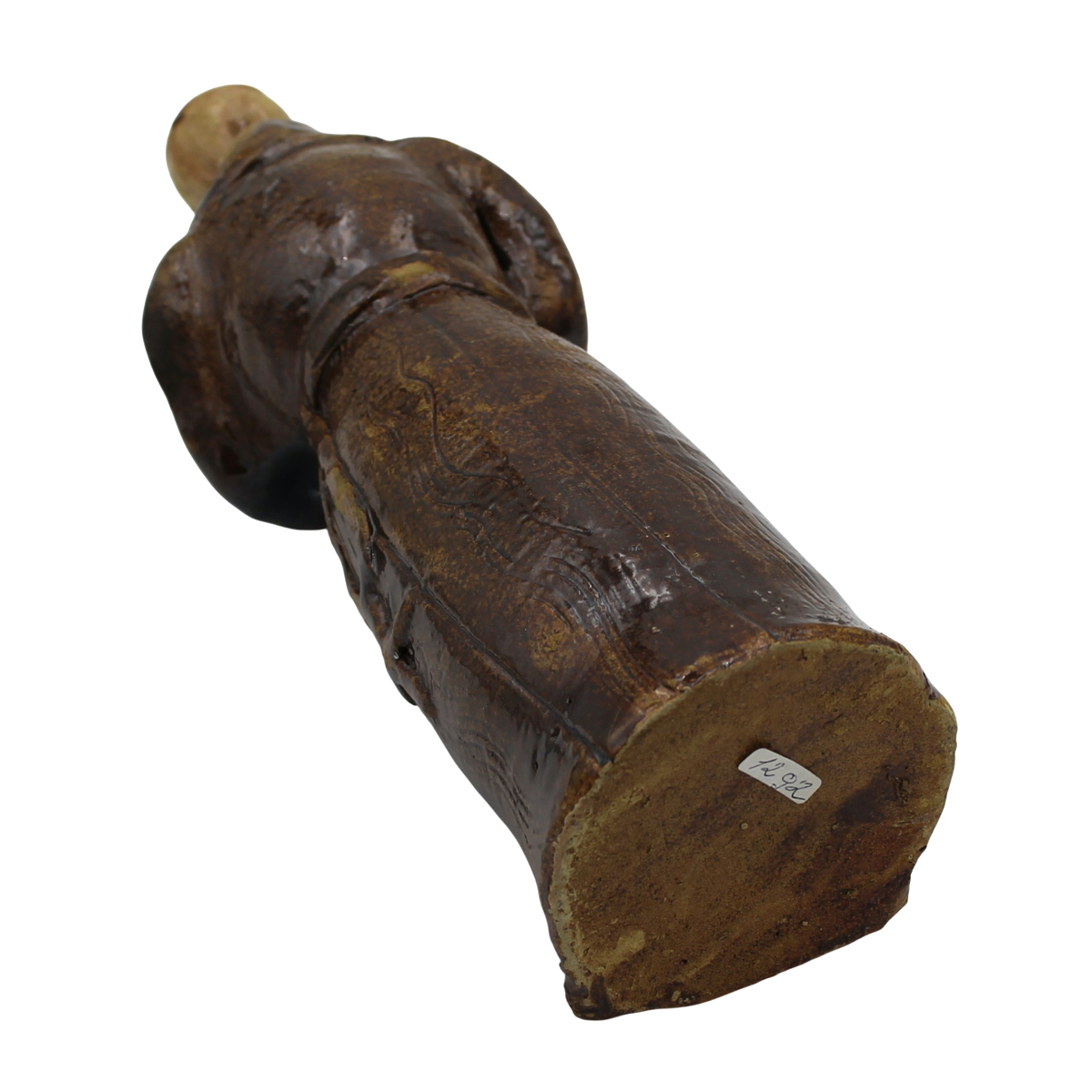Lucerna antropomorfa Maiolica policroma su fondo marrone. Collesano. Secolo XX. Cm h 31,5