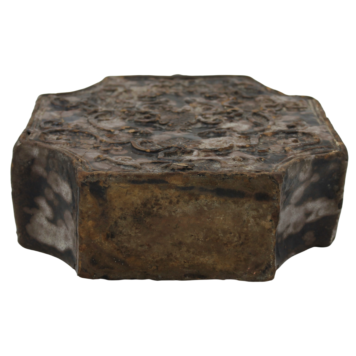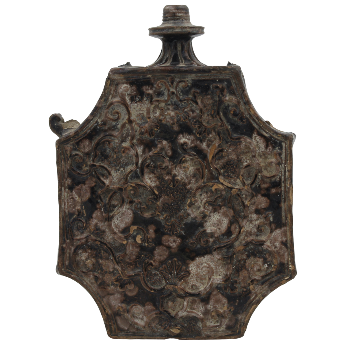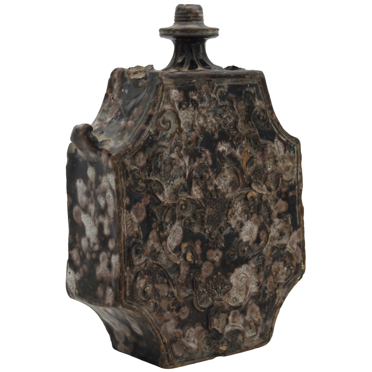 Particolare scaldino Antica maiolica manganese con decoro vegetale e ornamentale a rilievo su entrambi in lati (varie mancanze). Caltagirone. Secolo XVIII. Cm h 30,5