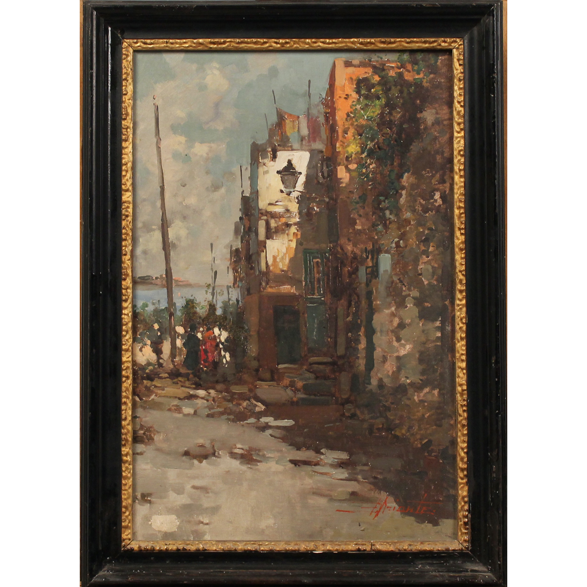 Ezelino Briante (1901/1971) "Scorcio di borgo marinaro" Dipinto ad olio su tela in cornice in legno. Cm 47x31