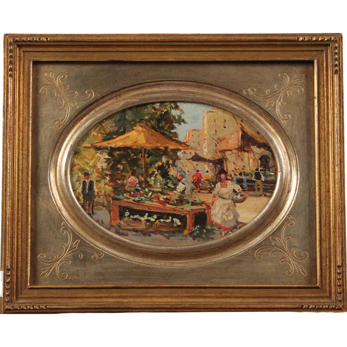 Pittore napoletano degli inizi del secolo XX "Al mercato" Dipinto ovale in cartone in cornice in legno dorato. Cm 12x17