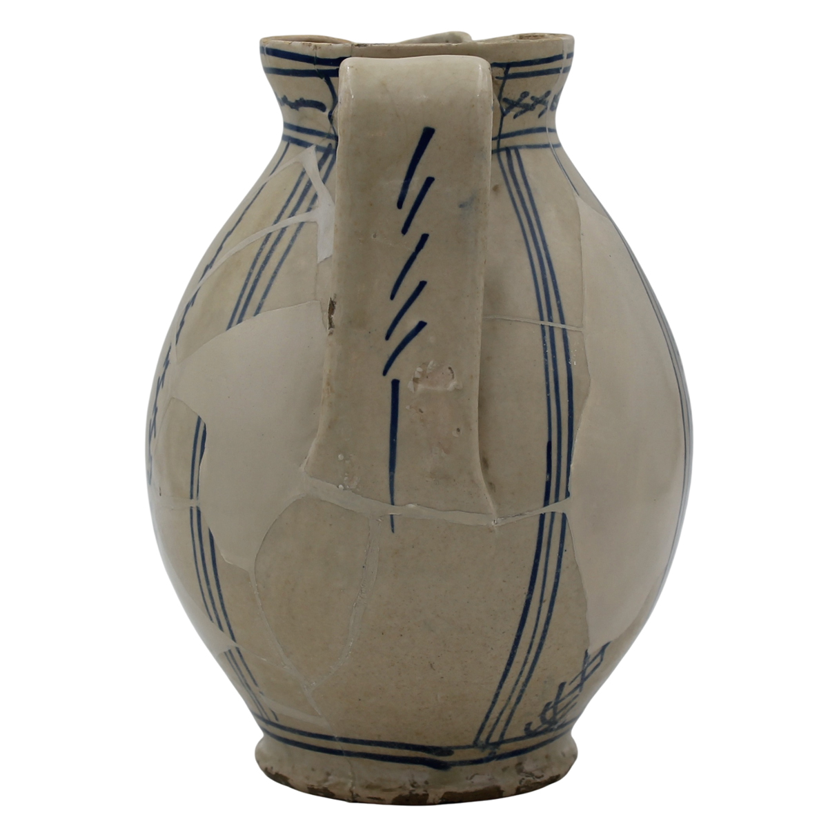 Brocca Antica maiolica decorata sul davanti a motivi geometrici policromi su fondo crema (evidenti rotture, ricostruzioni e restauri). Italia centrale. Secolo XVI. Cm h 25,5