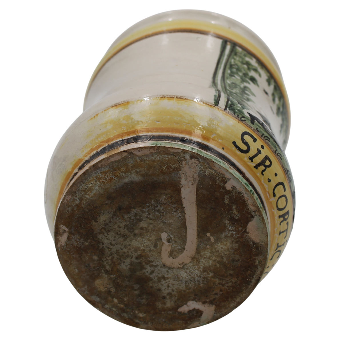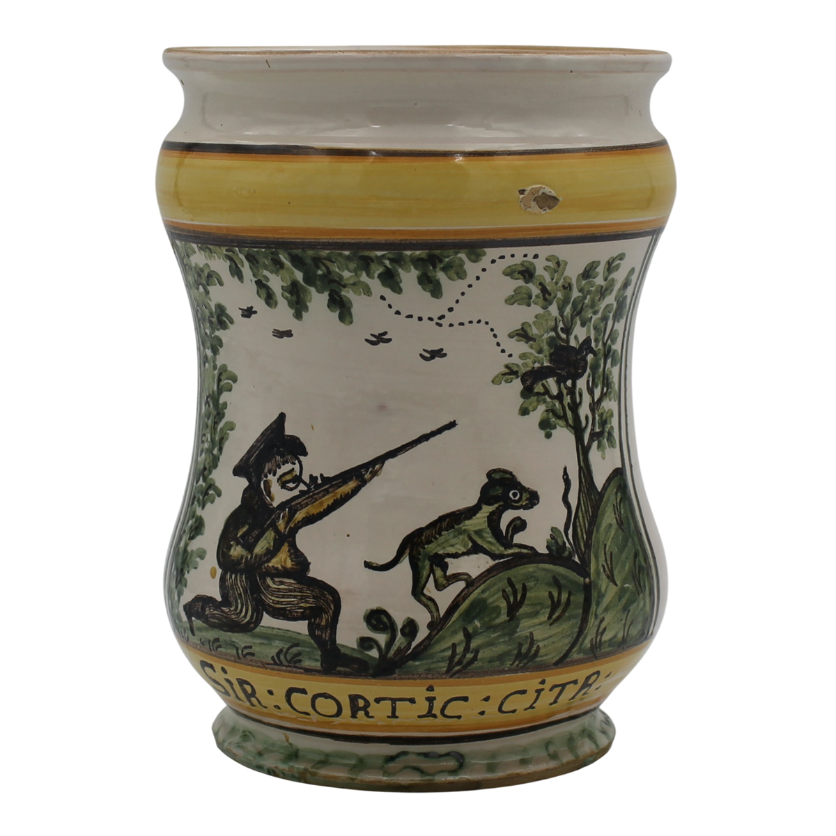 Cilindro Antica maiolica con decoro frontale raffigurante scena di caccia su fondo bianco. Vietri. Secolo XIX. Cm h 21