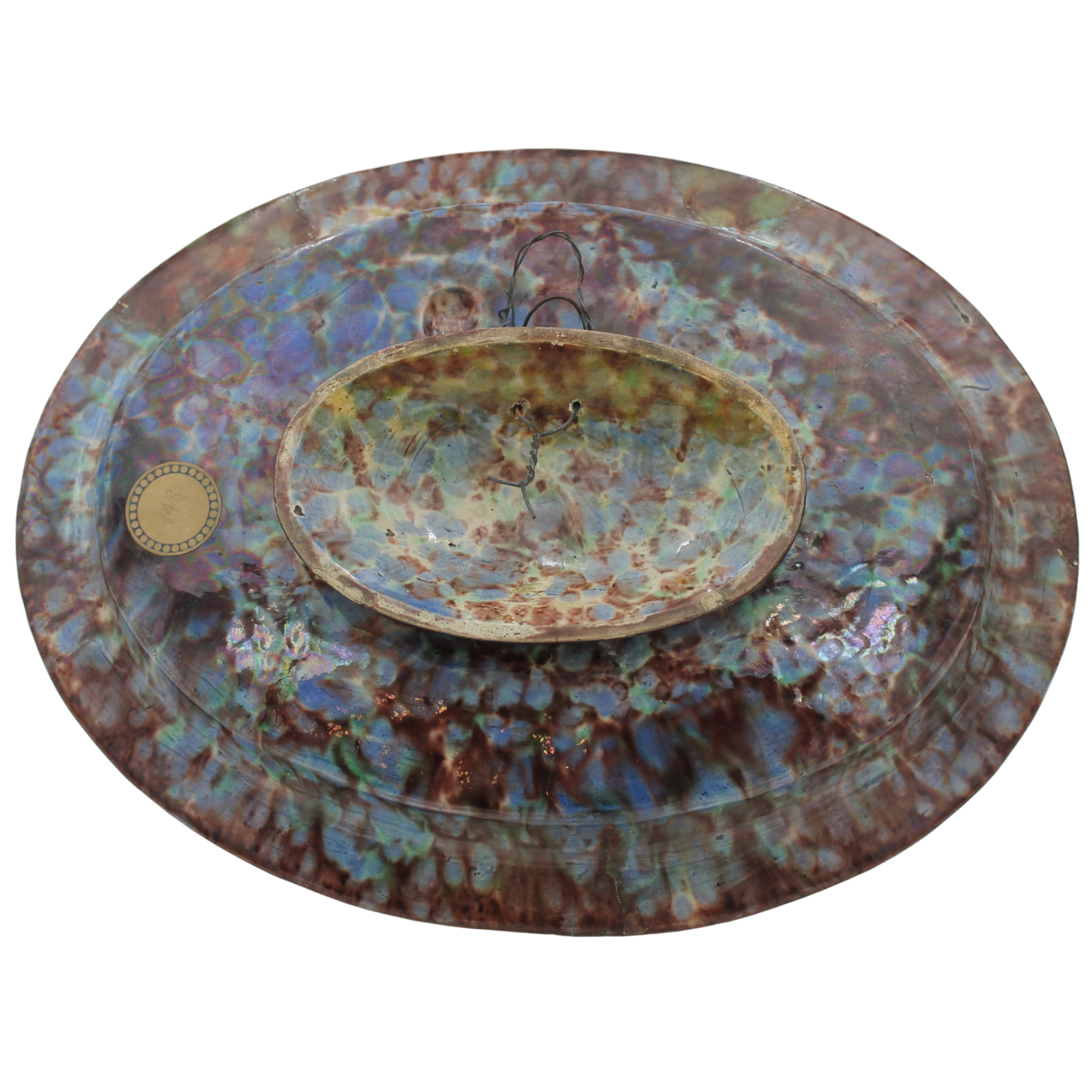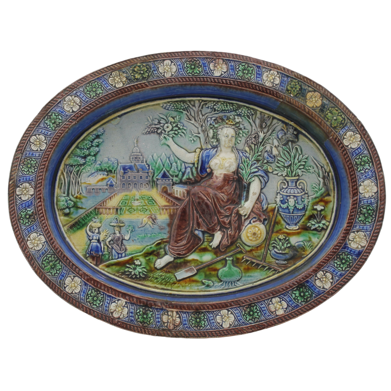 Scuola di Bernard Palissi "Vassoio ovale" Antica maiolica decorata con scena classica a rilievo nella parte centrale e motivi floreali incisi sul bordo (restauri sul bordo). Secolo XIX. Cm 32x26