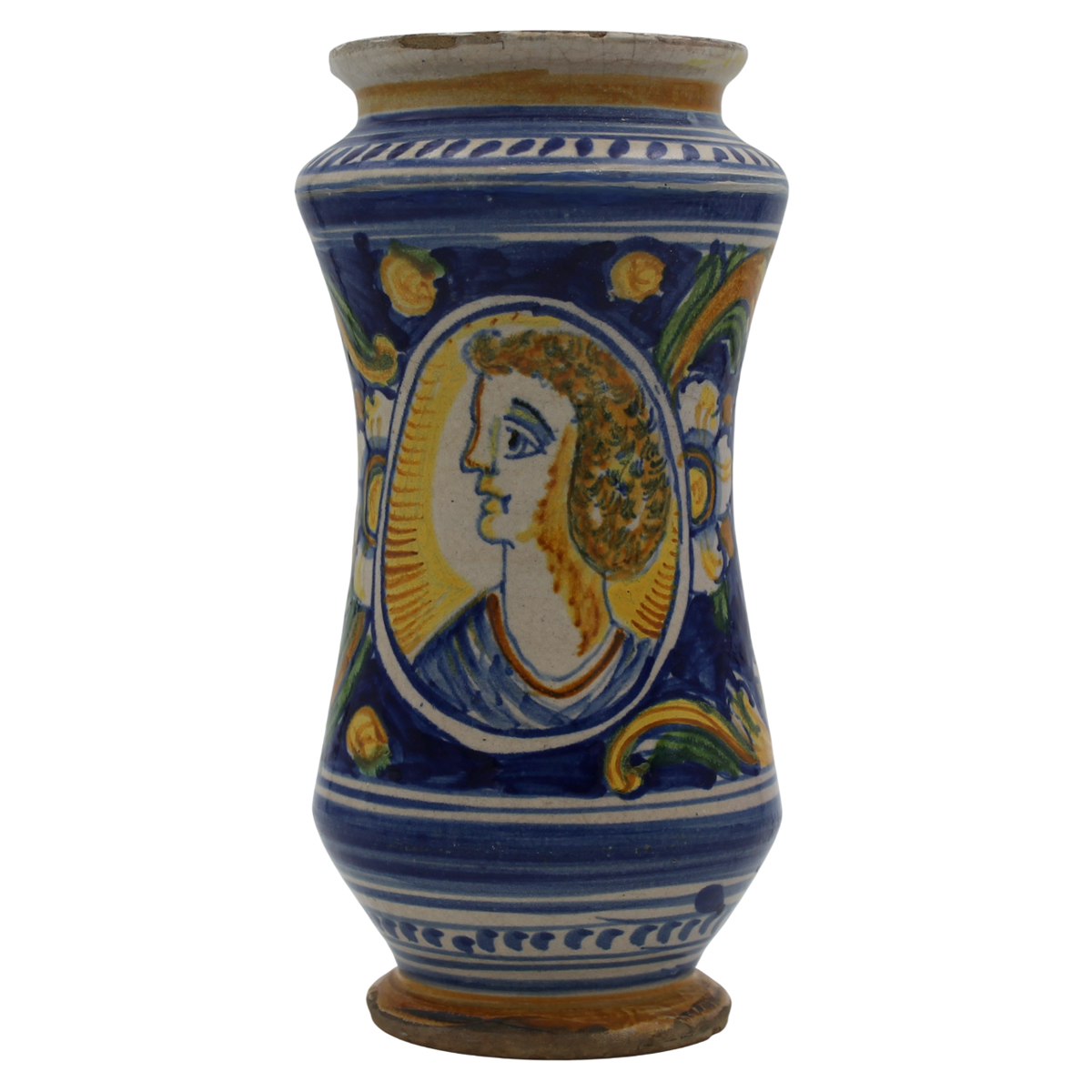 Albarello Antica maiolica decorata con profilo di ragazzo e motivi floreali e...