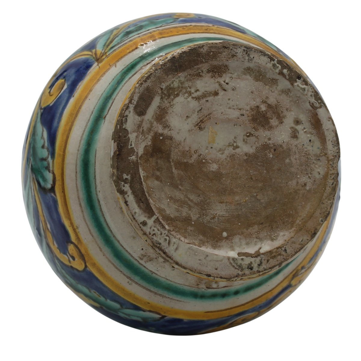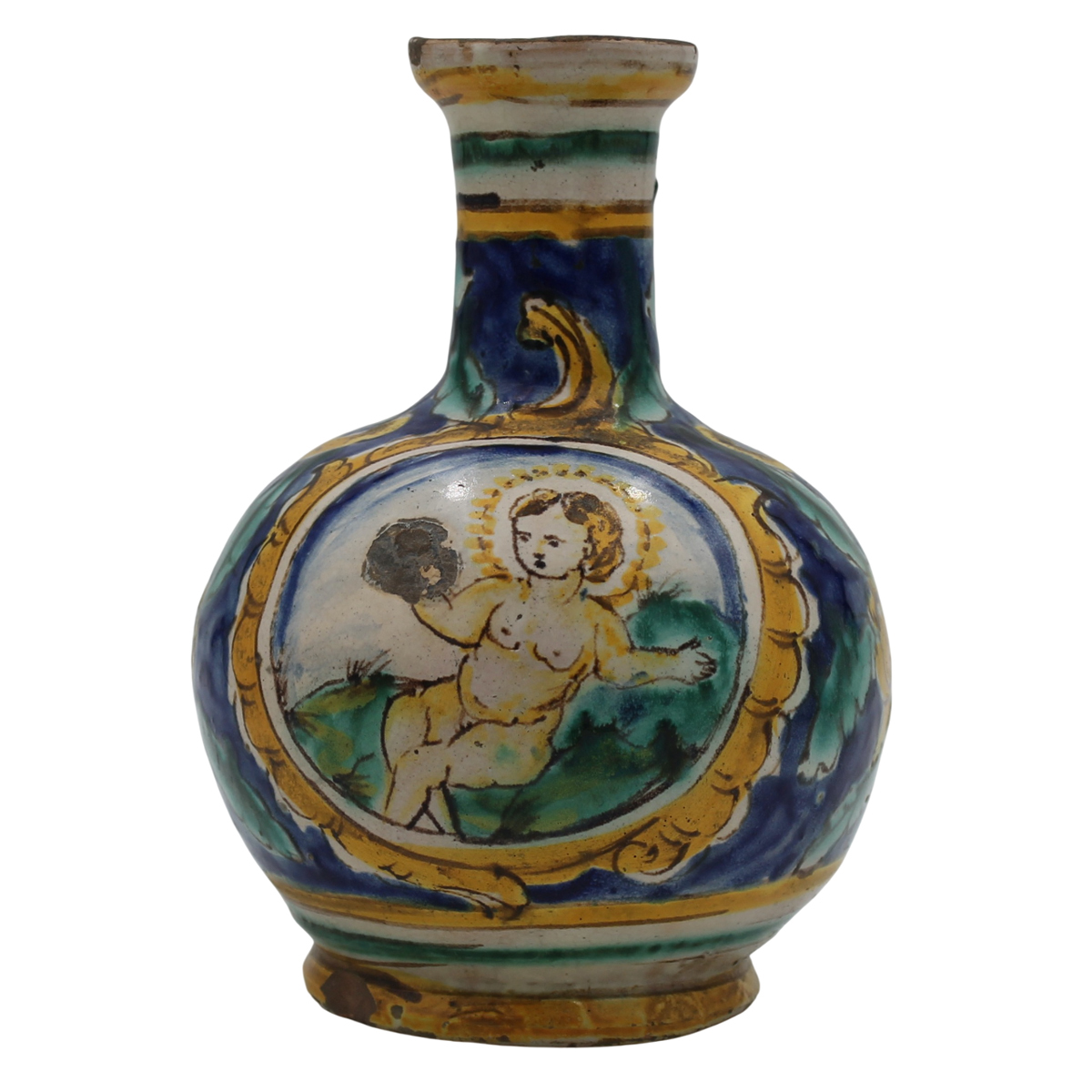 Bottiglia Antica maiolica decorata con figura del Bambinello, sul retro...