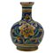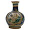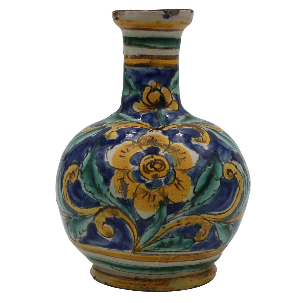 Bottiglia Antica maiolica decorata con figura del Bambinello, sul retro motivi floreali e vegetali policromi. Caltagirone. Secolo XVIII. Cm h 22