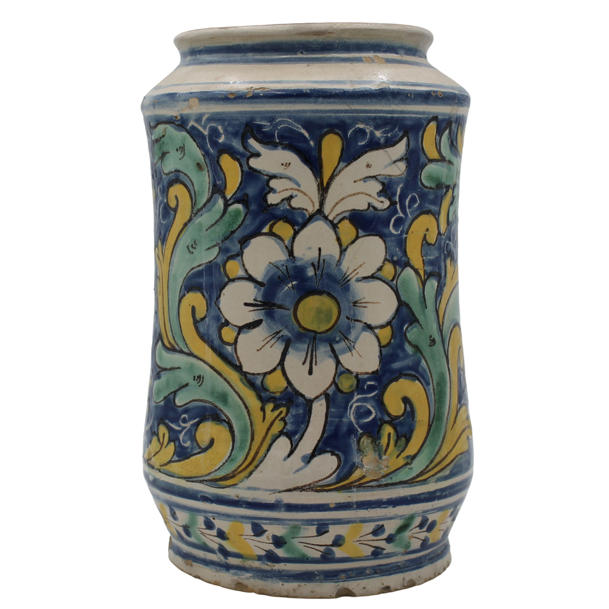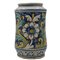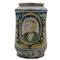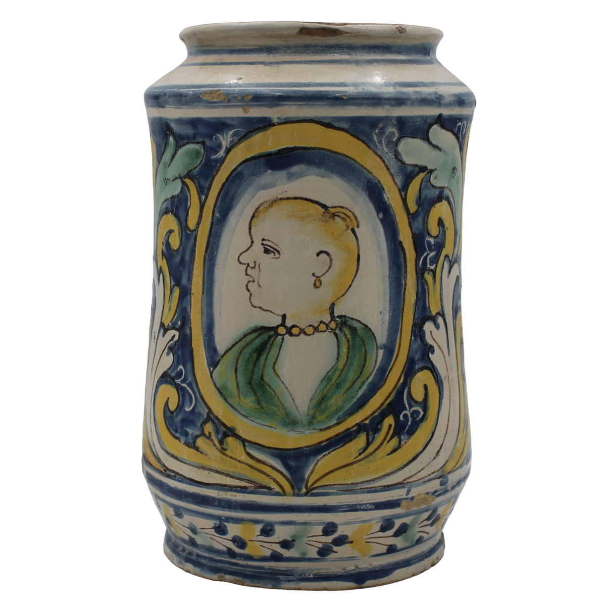 Grande cilindro Antica mailica decorata sul davanti con medaglione centrale raffigurante profilo di donna (feliure interne). Sul retro decoro a motivi vegetali e floreali policromi. Caltagirone. Secolo XVIII. Cm h 33