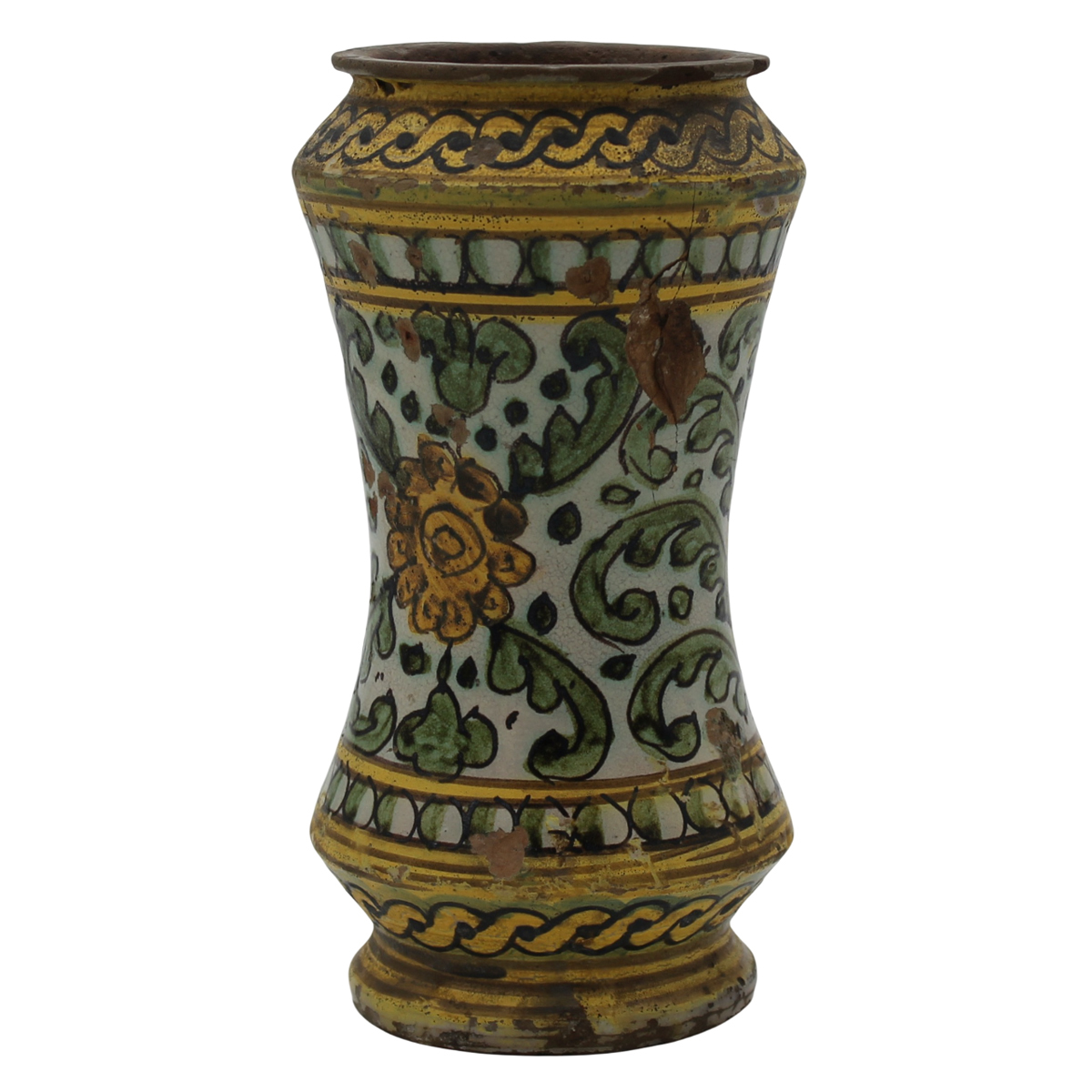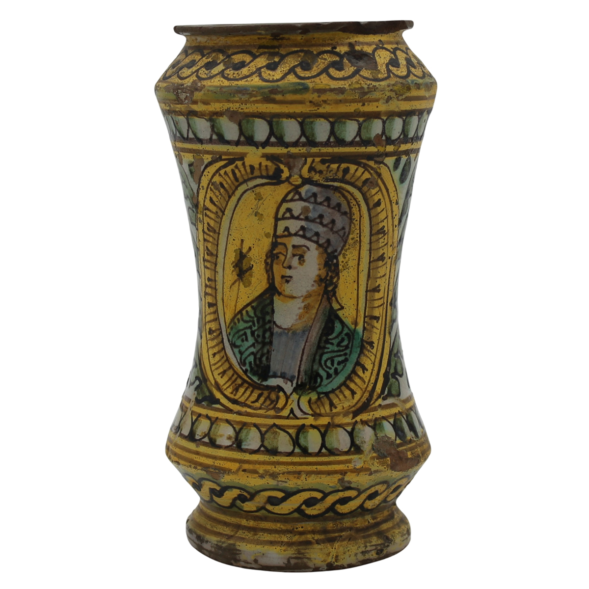 Albarello Antica maiolica con medaglione centrale raffigurante prelato e sul...