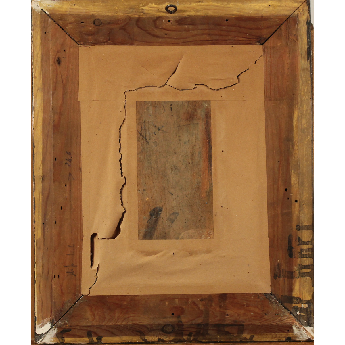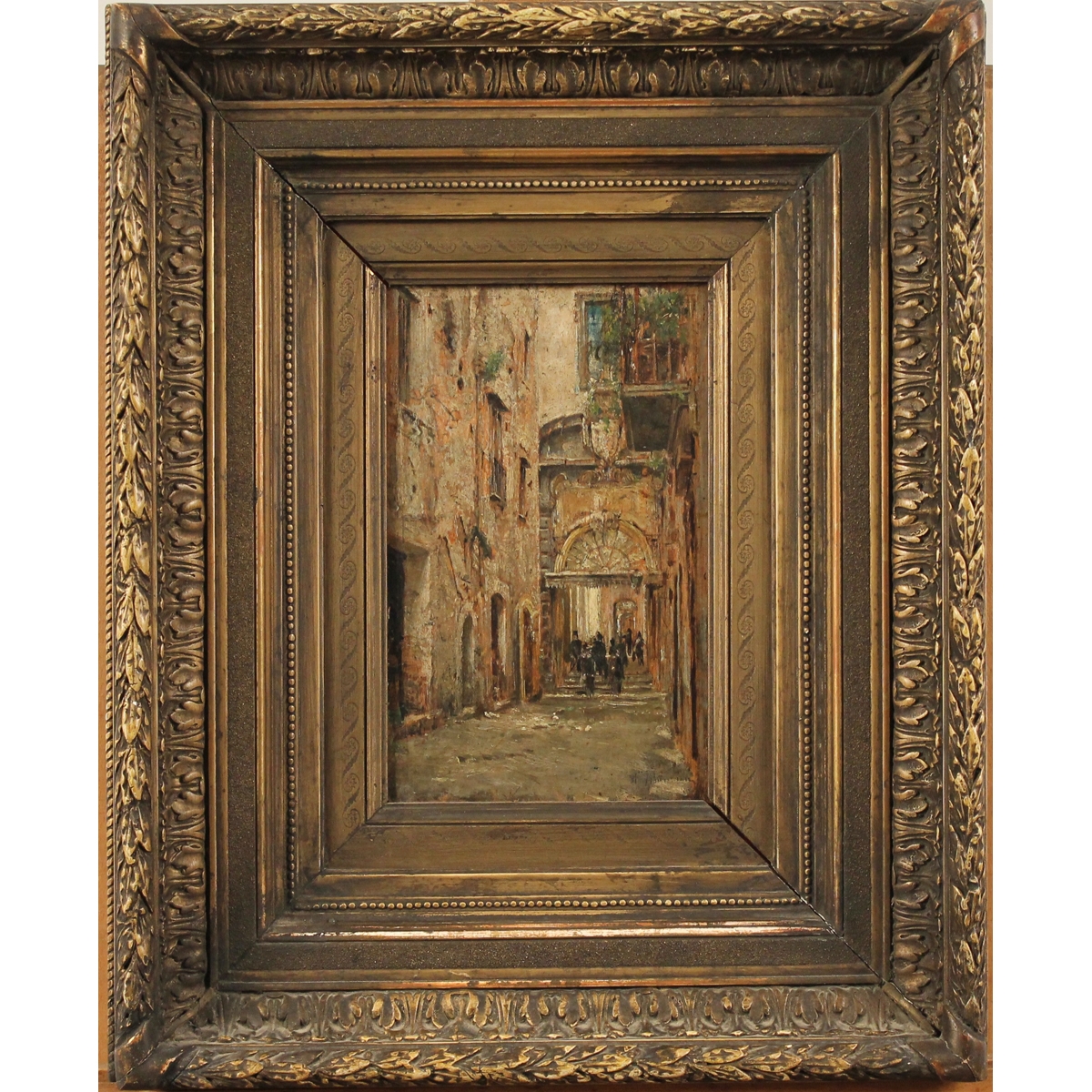 Pittore italiano degli inizi del secolo XX "Vicolo di città con figure" Dipinto ad olio su tavola in cornice in legno dorato. Firma indistinta. Cm 25x16
