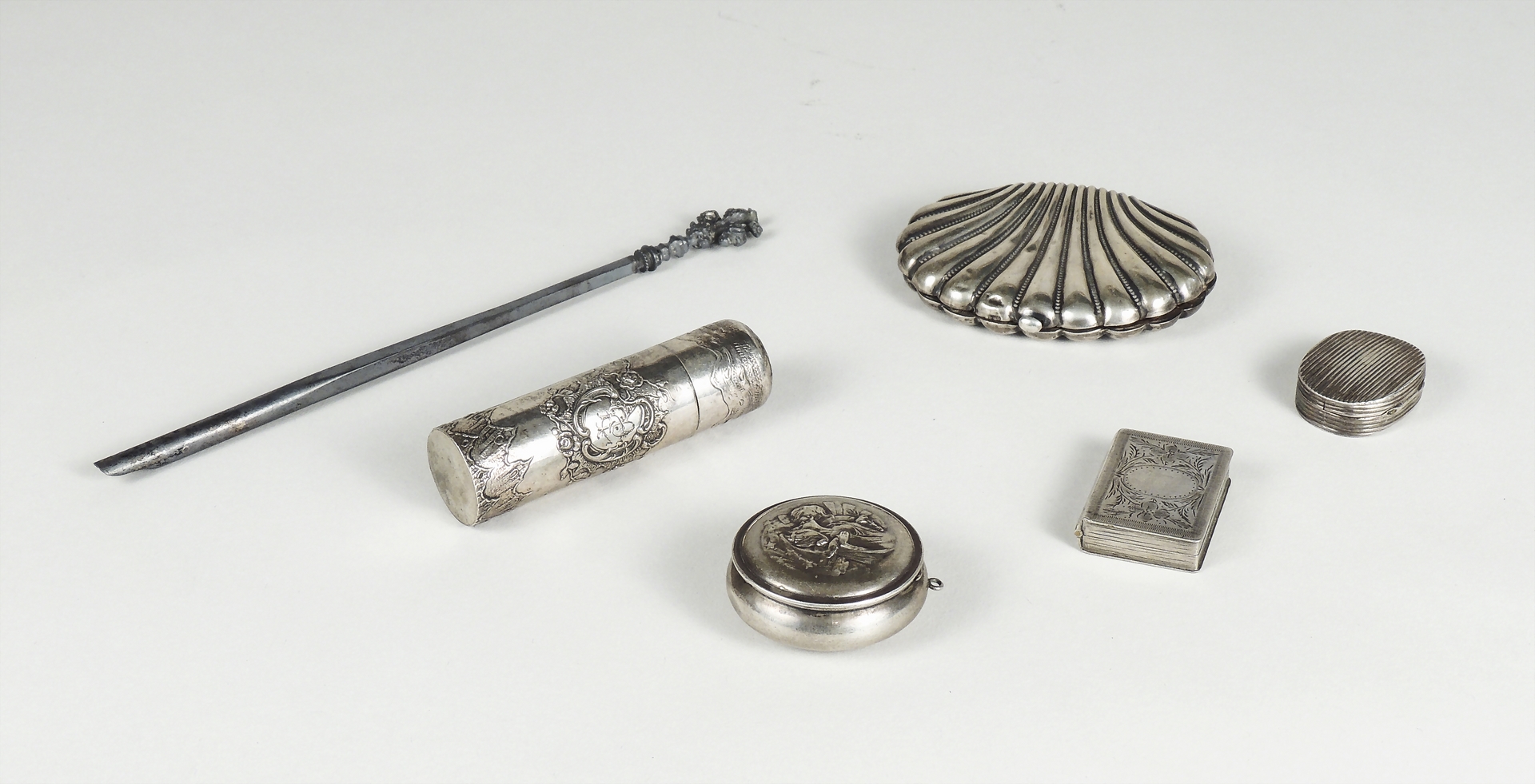 LOTTO DI CURIOSITÀ IN ARGENTO inizio del XX secolo tra cui un piccolocportamonete realizzato come una conchiglia, un porta profumo da borsetta, tre porta pillole ed una penna entro astuccio (6)