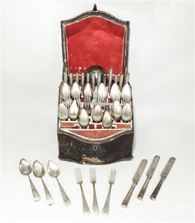 SERVITO DI POSATE IN ARGENTO Firenze, XIX secolo composto da 24 forchette, 24 cucchiai, 24 coltelli, tre posate da portata, ramaiolo e sette cucchiaini simili, il servito è composto da due serviti simili, uno recante incise le iniziali P e l'altro PFC, corredato di una scatola d'epoca verticale ornata da galloni argentati gr complessivi esclusi i coltelli 3530 (83)