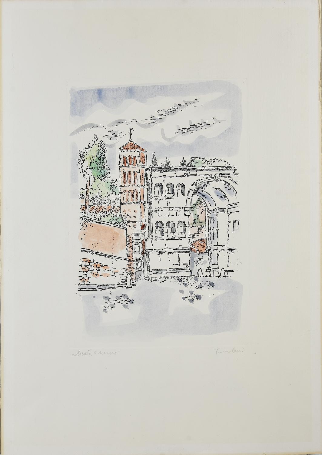Orfeo Tamburi PAESAGGIO CON ARCO incisione acquarellata a mano, cm 40x28, su...