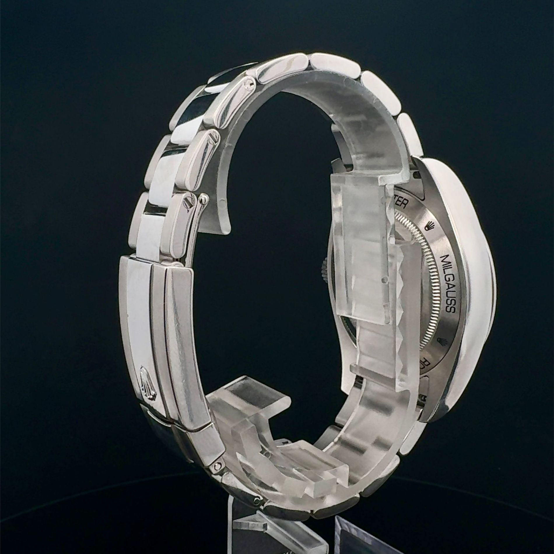 Marca Rolex Modello (Orologio) Milgauss Numero di referenza 116400GV Carica Automatico Materiale della cassa Acciaio Materiale cinturino Acciaio Anno di produzione 2008/ 2010Corredo documenti originali Rolex, no box Materiale della cassa Acciaio Diametro 40 mm Impermeabile 10 ATM Materiale lunetta Acciaio Vetro Vetro zaffiro Quadrante Nero Numeri sul quadrante Senza numeri Cinturino Materiale cinturino Acciaio Colore cinturino Acciaio Chiusura Déployante Materiale chiusura Acciaio Altro