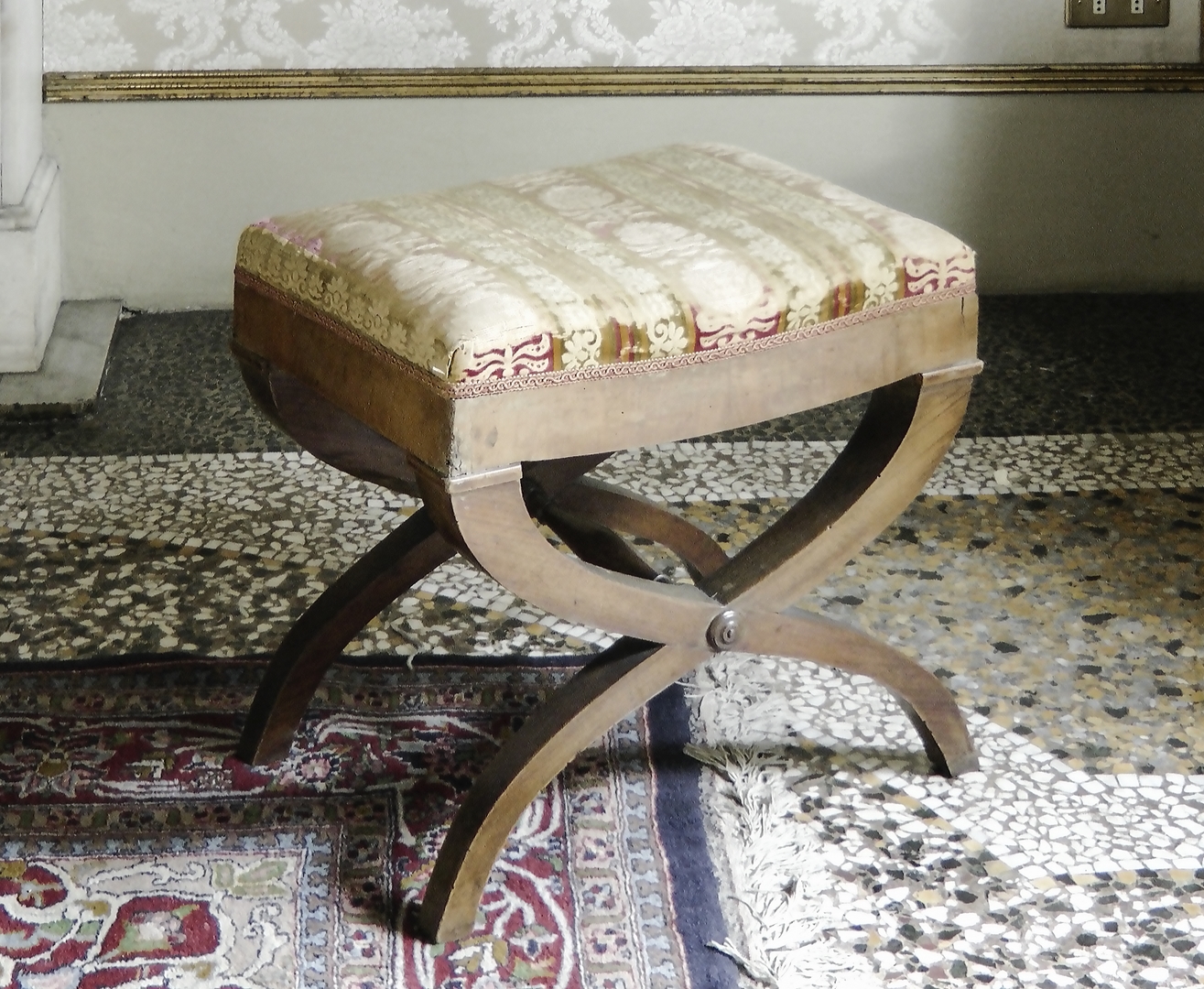 SGABELLO IN NOCE XIX secolo gambe a faldistorio, seduta imbottita e rivestita in tessuto rigato, difetti