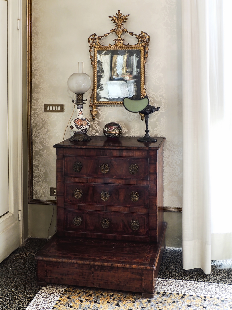 INGINOCCHIATOIO IMPIALLACCIATO IN NOCE E RADICA DI NOCE XVIII secolo intarsiato con filettature, fronte a tre cassetti ed uno nella base h cm 90x73x66