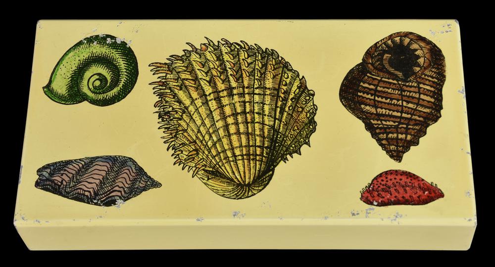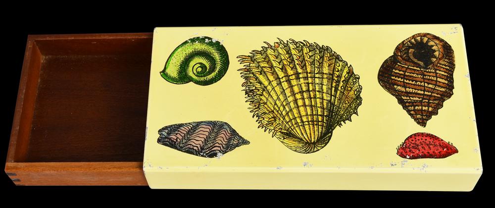 SCATOLA DECORATA CON CONCHIGLIE metallo serigrafato e mogano, cm 3,5x20x10,2...