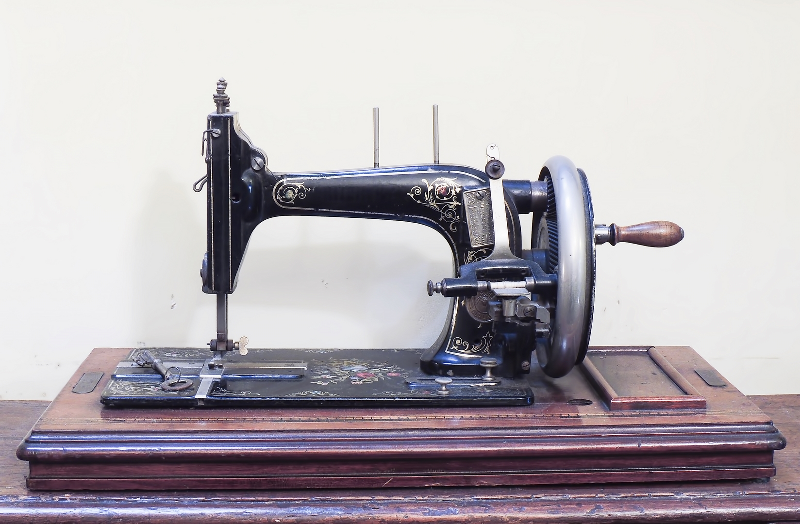 MACCHINA DA CUCIRE A MANOVELLA fine del XIX secolo intarsiata in madreperla, su base in legno