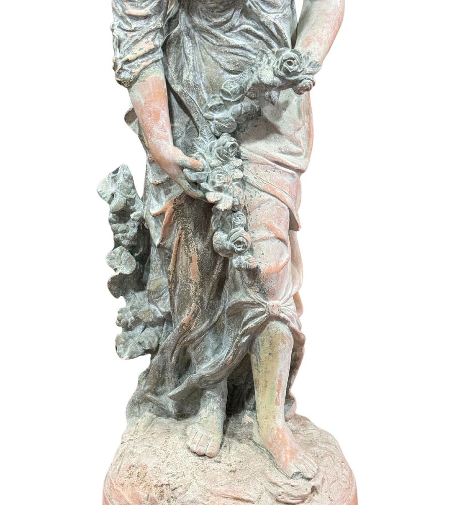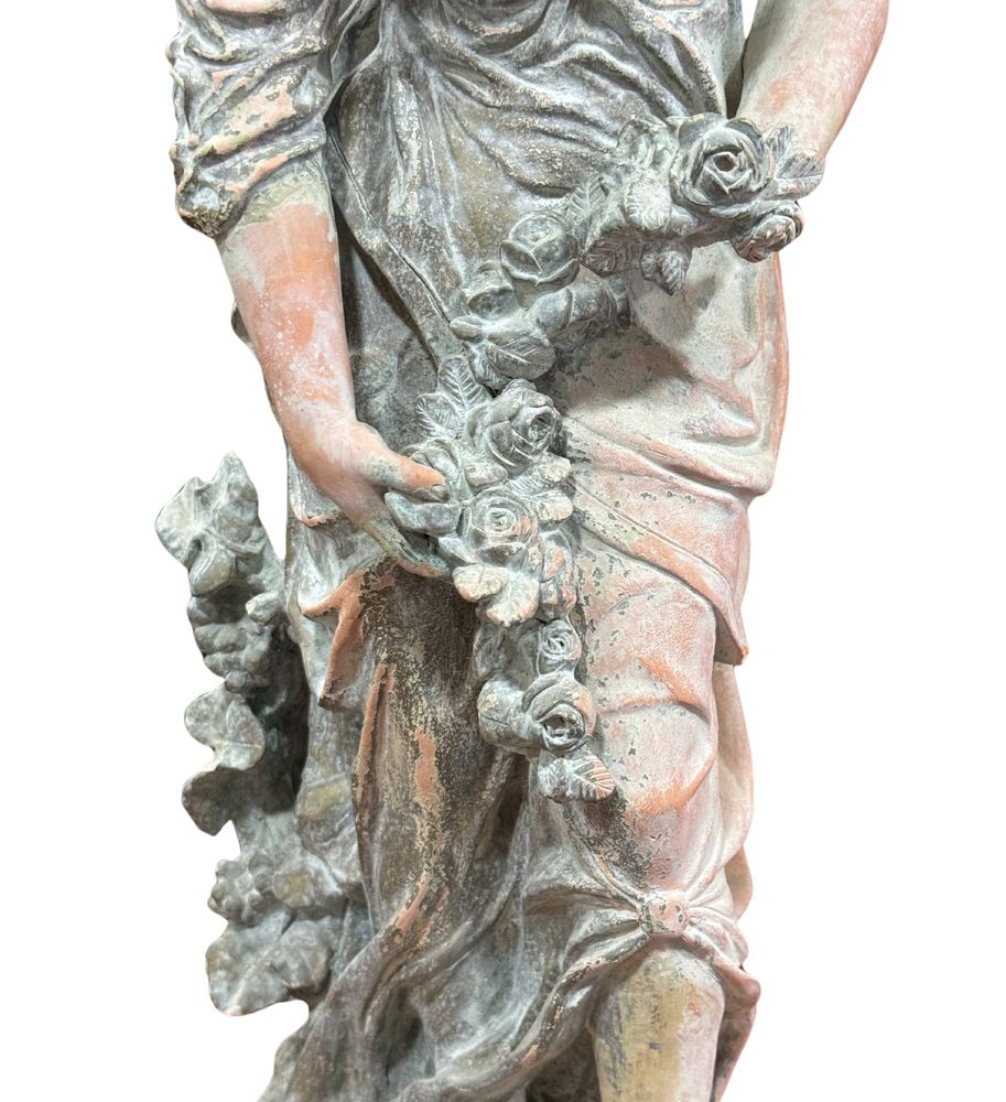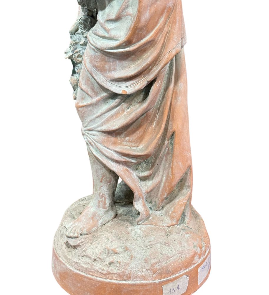 Scultura in terracotta, periodo XX secolo raffigurante Donna con fiori. Dimensioni: h66x22x22 cm. Scultura in buone condizioni con lievi segni di vissuto come da foto allegate.