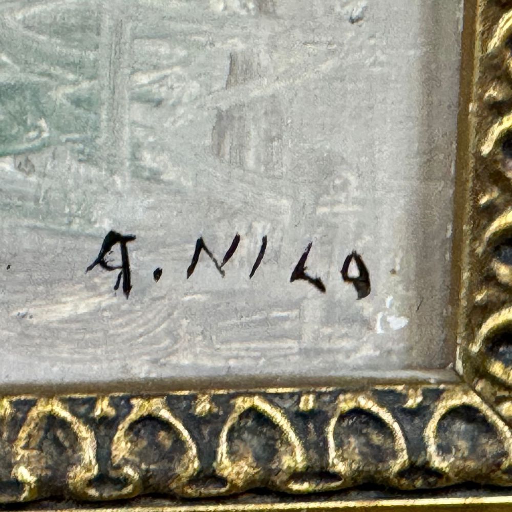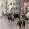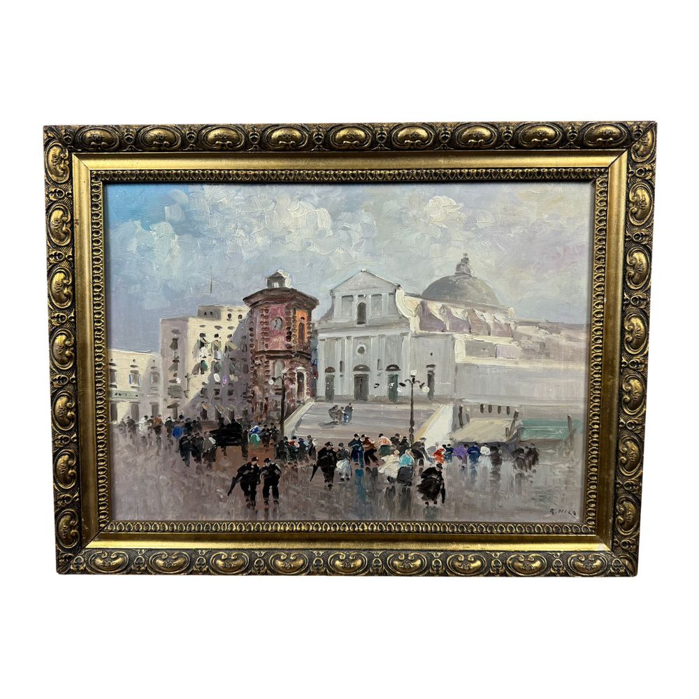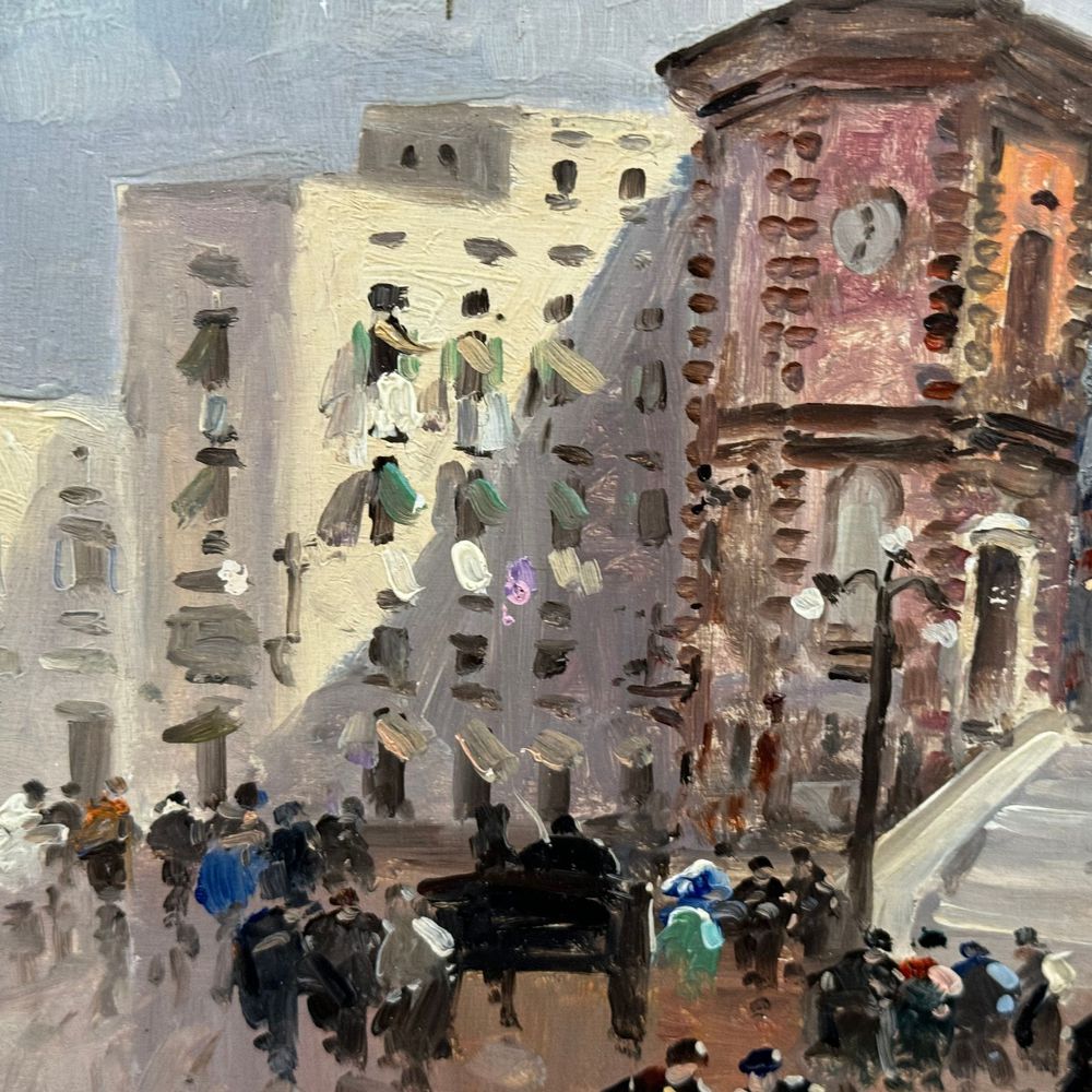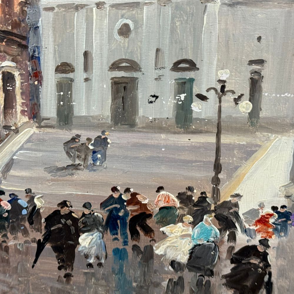 Dipinto olio su tavola, periodo XX secolo scuola Italiana, raffigurante Strada di città con personaggi (luogo imprecisato). Dimensioni interno cornice: 35x25 cm. Dimensioni compreso cornice: 42x32 cm. Reca firma in basso a destra da artista non identificato. Opera in buone condizioni.