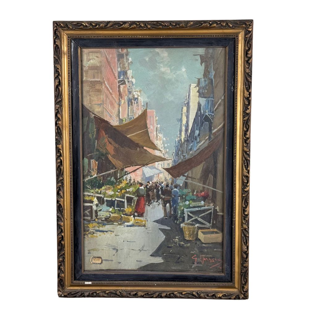 Dipinto olio su tela, periodo prima metà del XX secolo scuola Italiana, raffigurante Mercatino napoletano. Dimensioni interno cornice: 30x45 cm. Dimensioni compreso cornice: 37x53 cm. Reca firma in basso a destra da G. Maresca .Opera in buone condizioni.