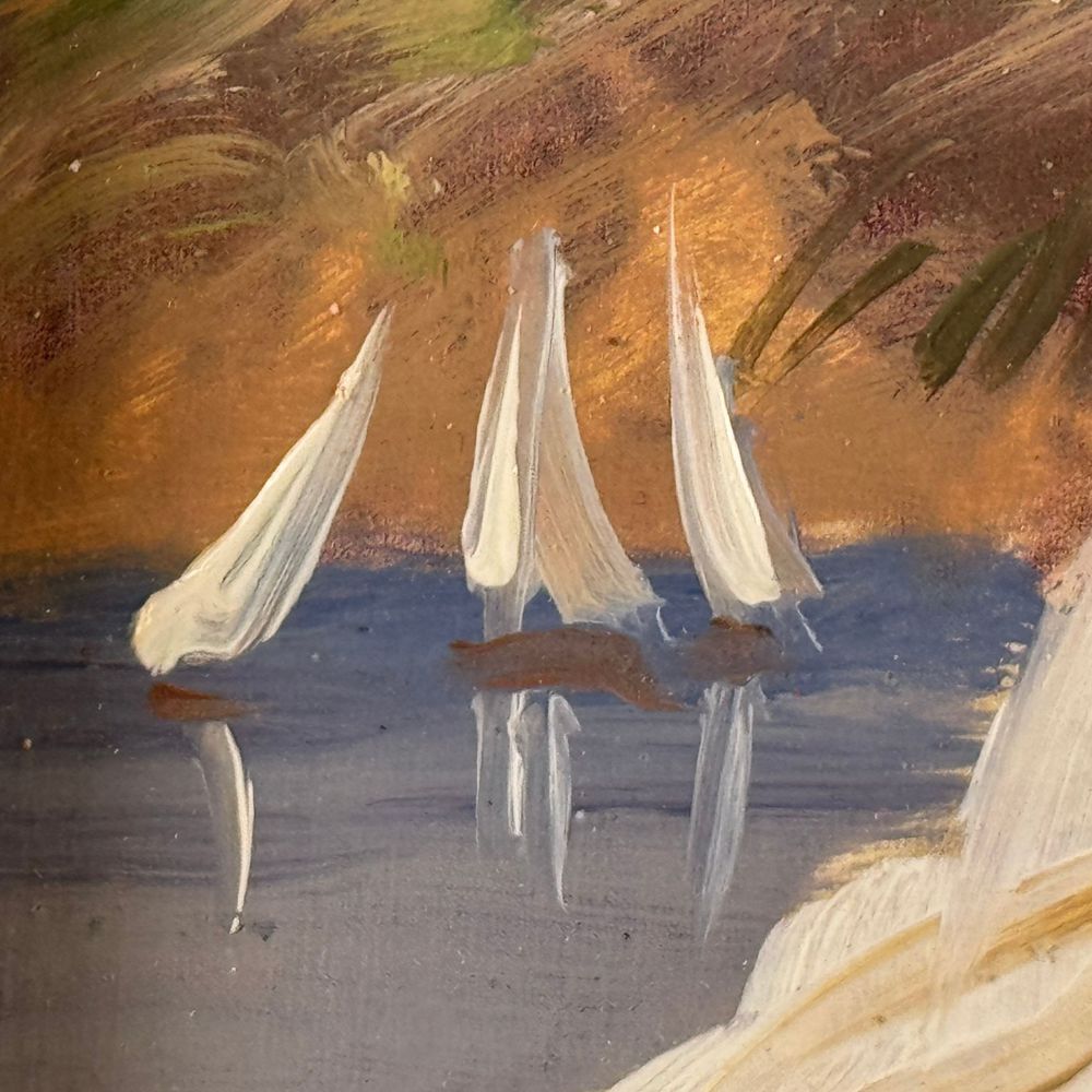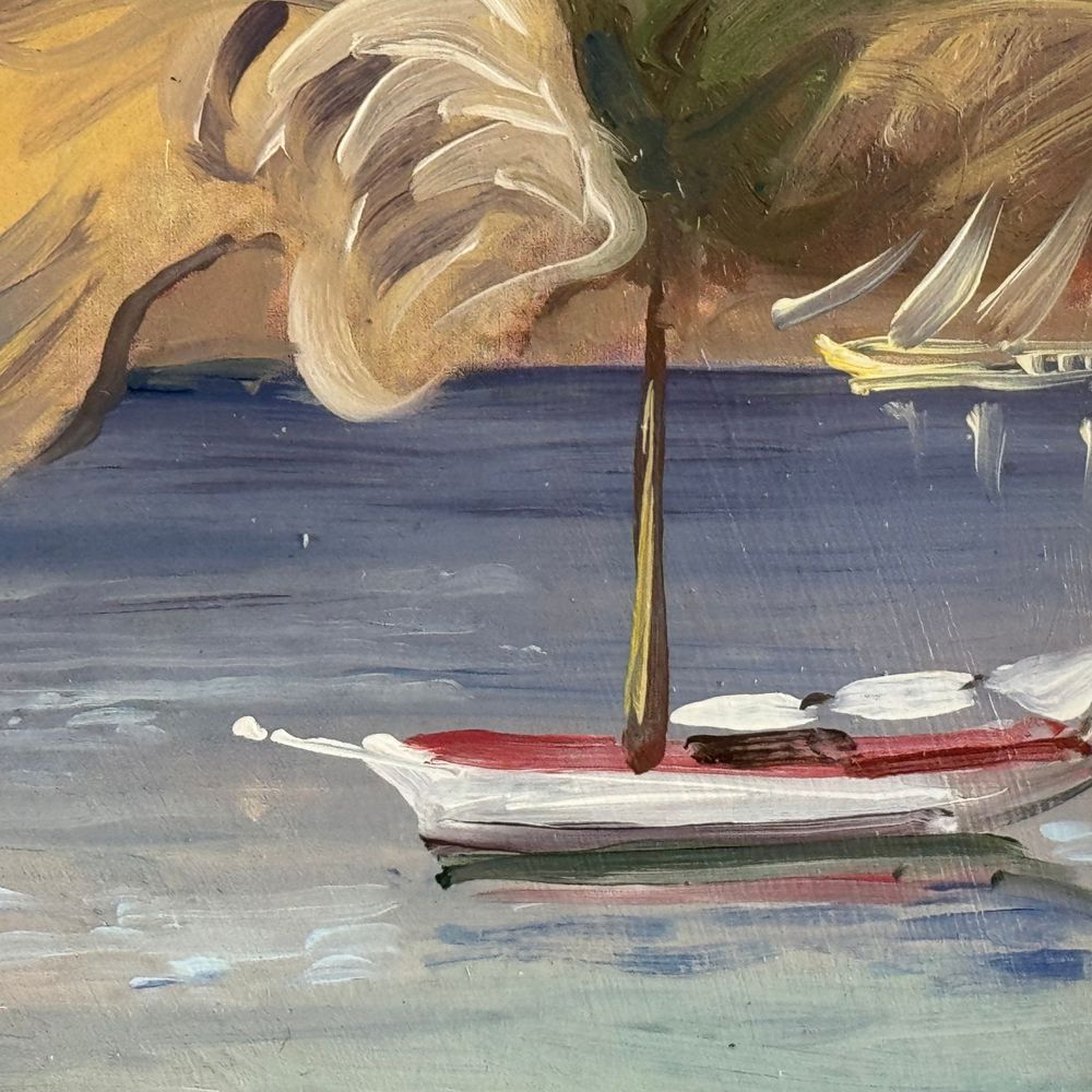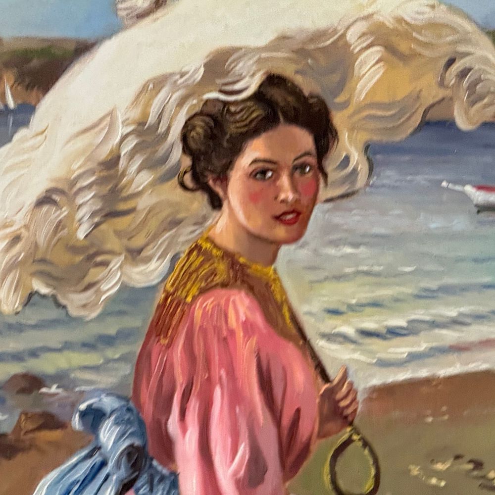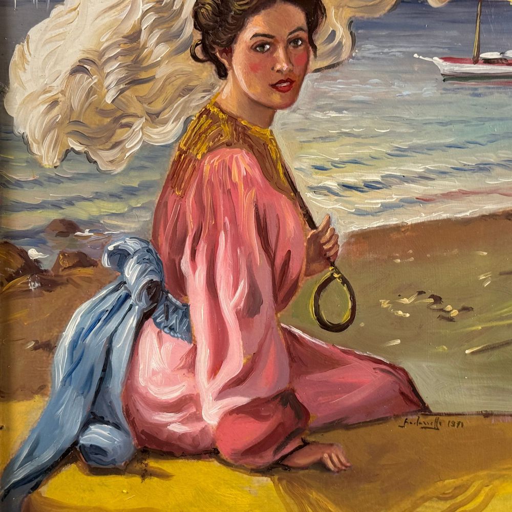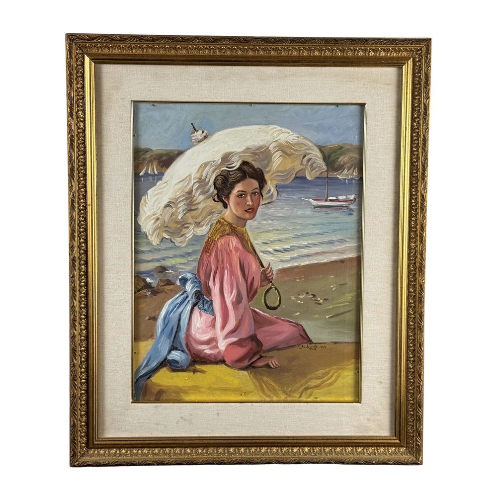 Dipinto olio su pannello, periodo XX secolo scuola Italiana, raffigurante Ritratto di donna con ombrellino su marina. Dimensioni interno cornice: 35x45 cm. Dimensioni compreso cornice: 53x63. Reca firma in basso a destra da artista non identificato. Opera in buone condizioni.