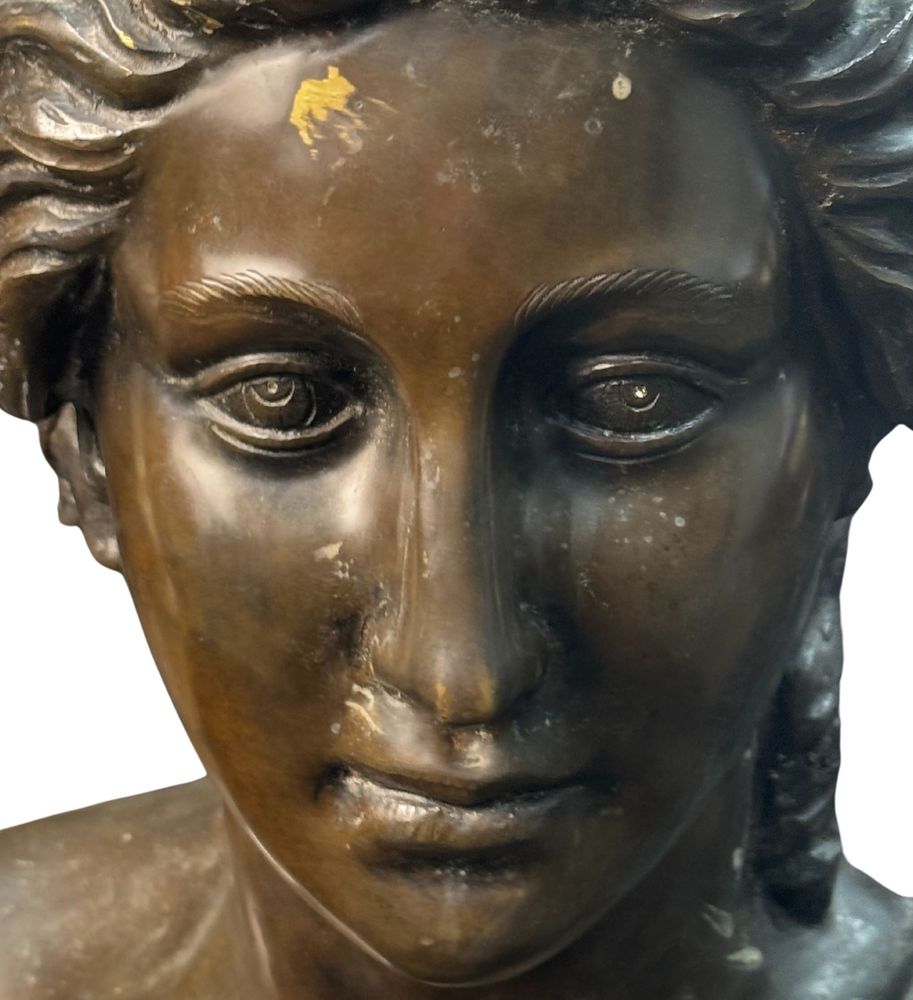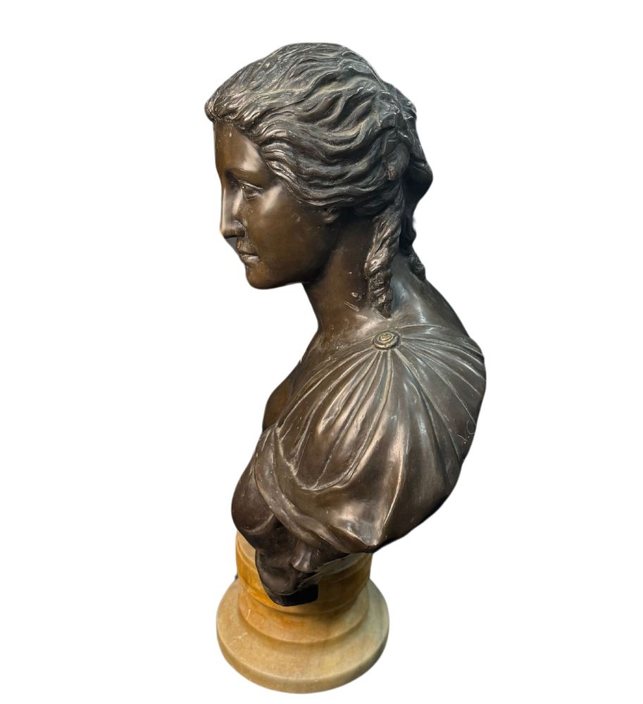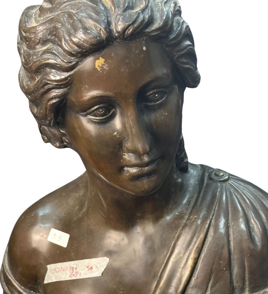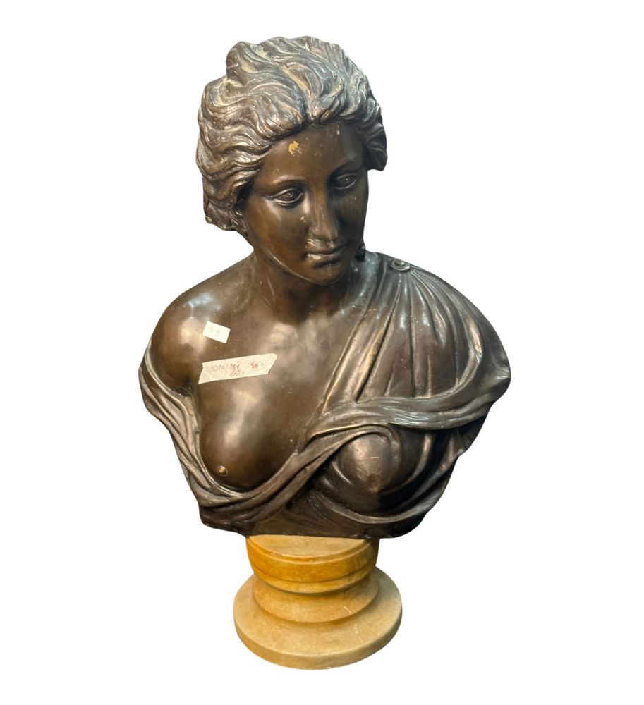 Scultura in bronzo, patinato a cera persa, su base in marmo, periodo XX secolo, raffigurante Busto di donna. Reca firma Vincenzo Cinque. Dimensioni: 76x50x20. Opera in buone condizioni.