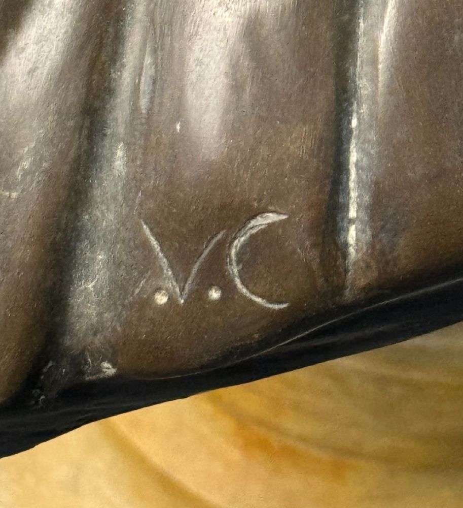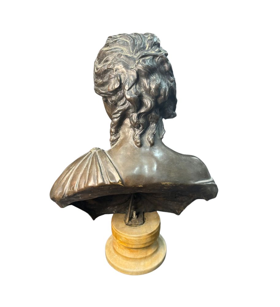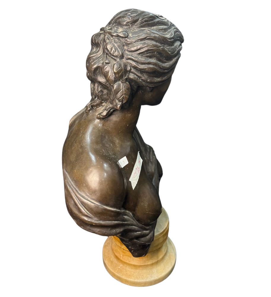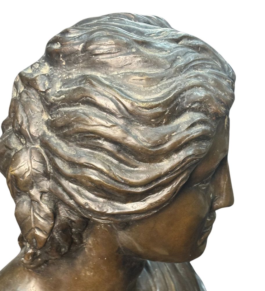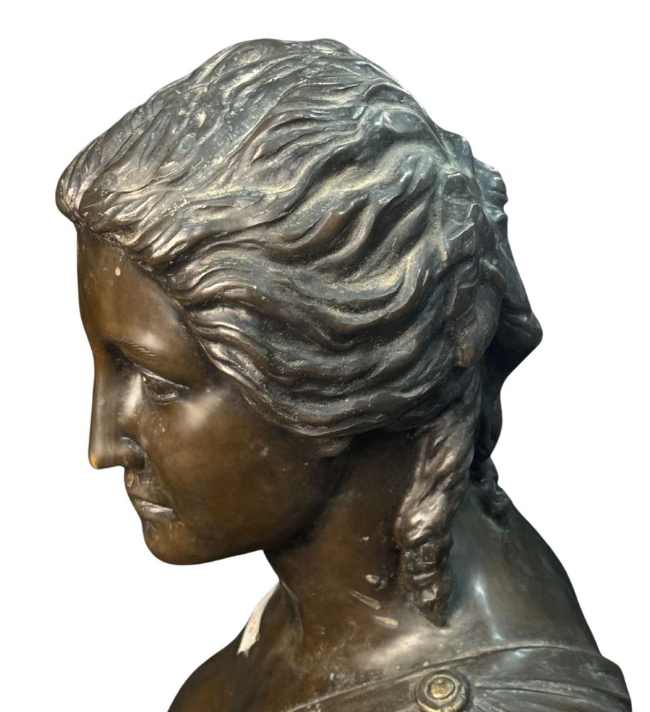 Scultura in bronzo, patinato a cera persa, su base in marmo, periodo XX secolo, raffigurante Busto di donna. Reca firma Vincenzo Cinque. Dimensioni: 76x50x20. Opera in buone condizioni.