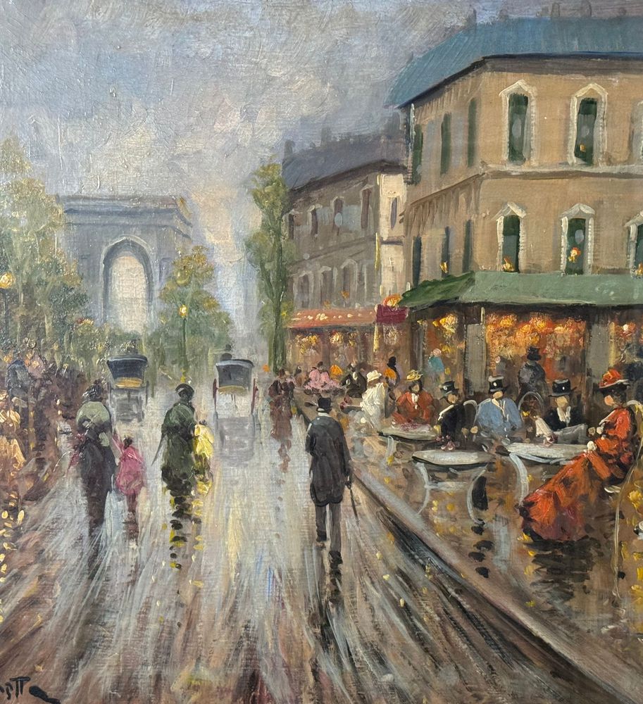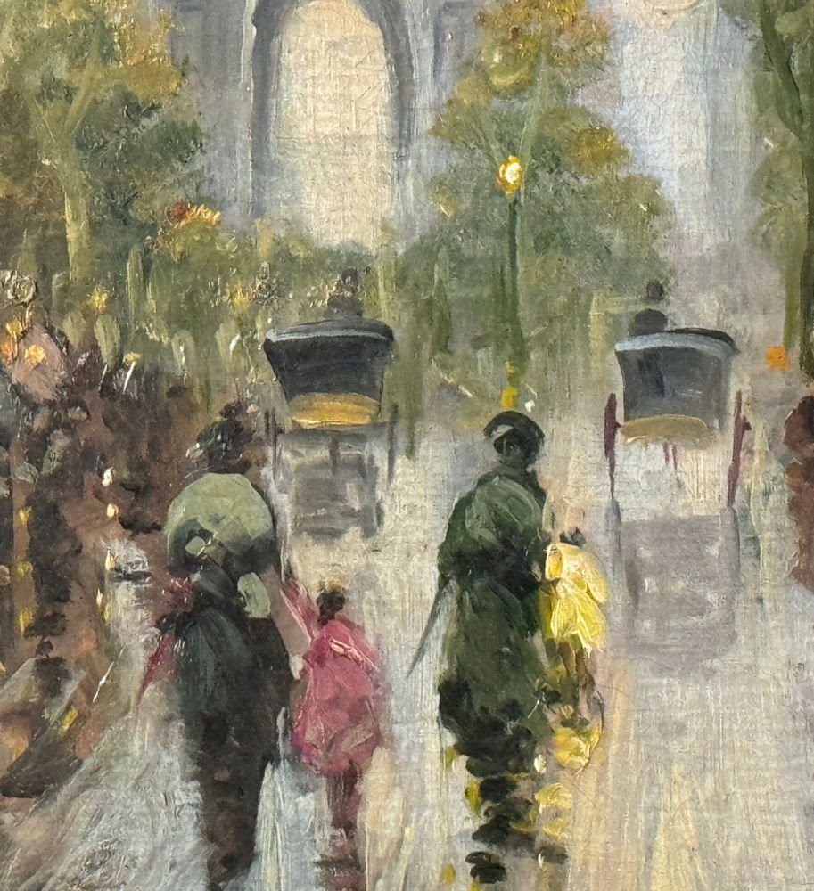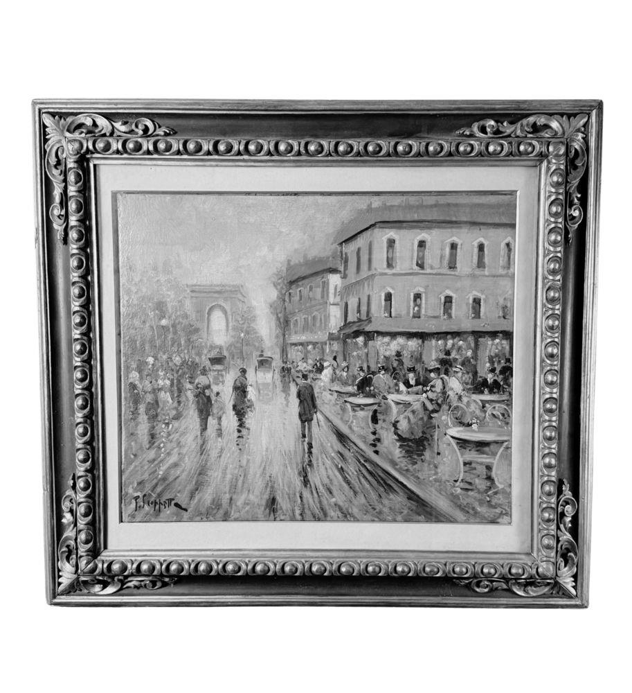 Dipinto olio su tela, periodo XX secolo scuola Italiana, raffigurante Strada di Parigi, omaggio a Pietro Scoppetta. Dimensioni compreso cornice: 85x78 cm. Dimensioni interno cornice: 60x50 cm. Da artista anonimo. Opera in buone condizioni.