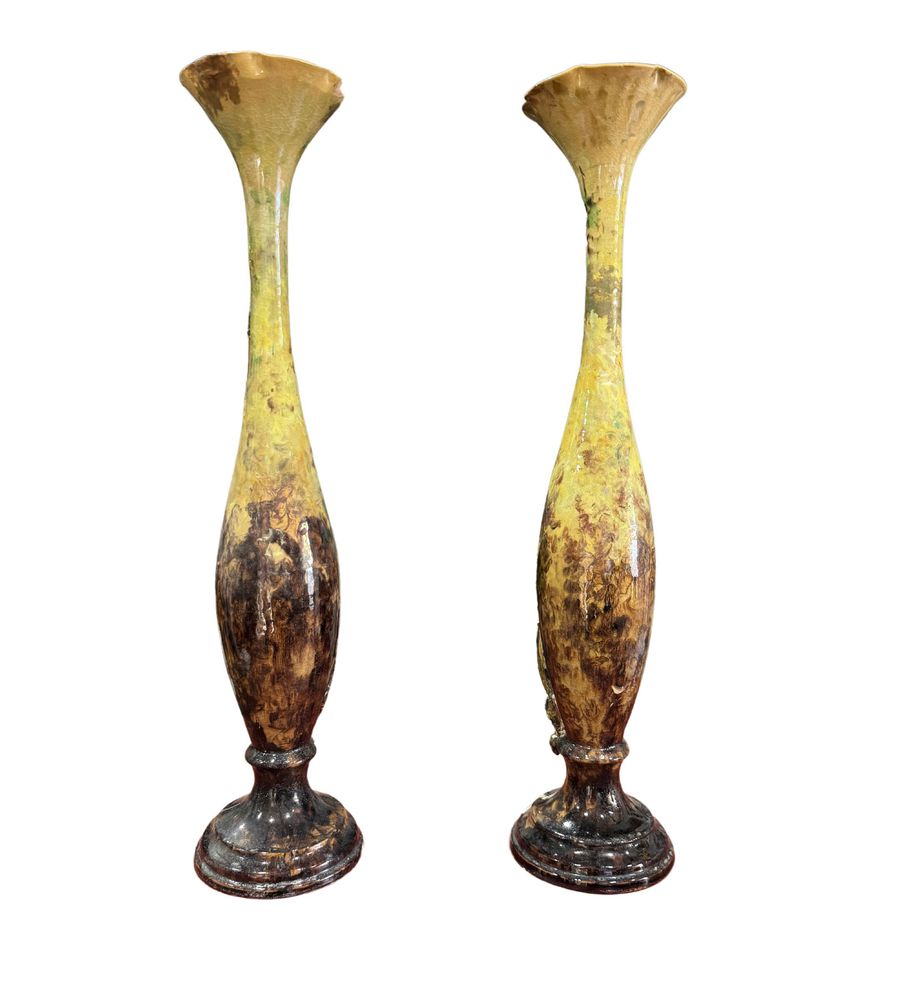 Coppia di vasi in ceramica, periodo XX secolo. Dimensioni: 72x15x15 cm. Piccole mancanze e lievi segni di vissuto come da foto allegate.