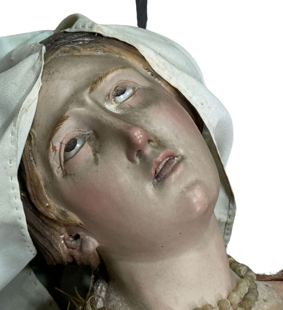 Scultura da presepe in legno, periodo XVIII secolo raffigurante Vergine Maria. Dimensioni: h80 cm. Scultura così composta: Testa, mani e piedi in legno scolpito. Occhi in vetro e corpo in canapa.